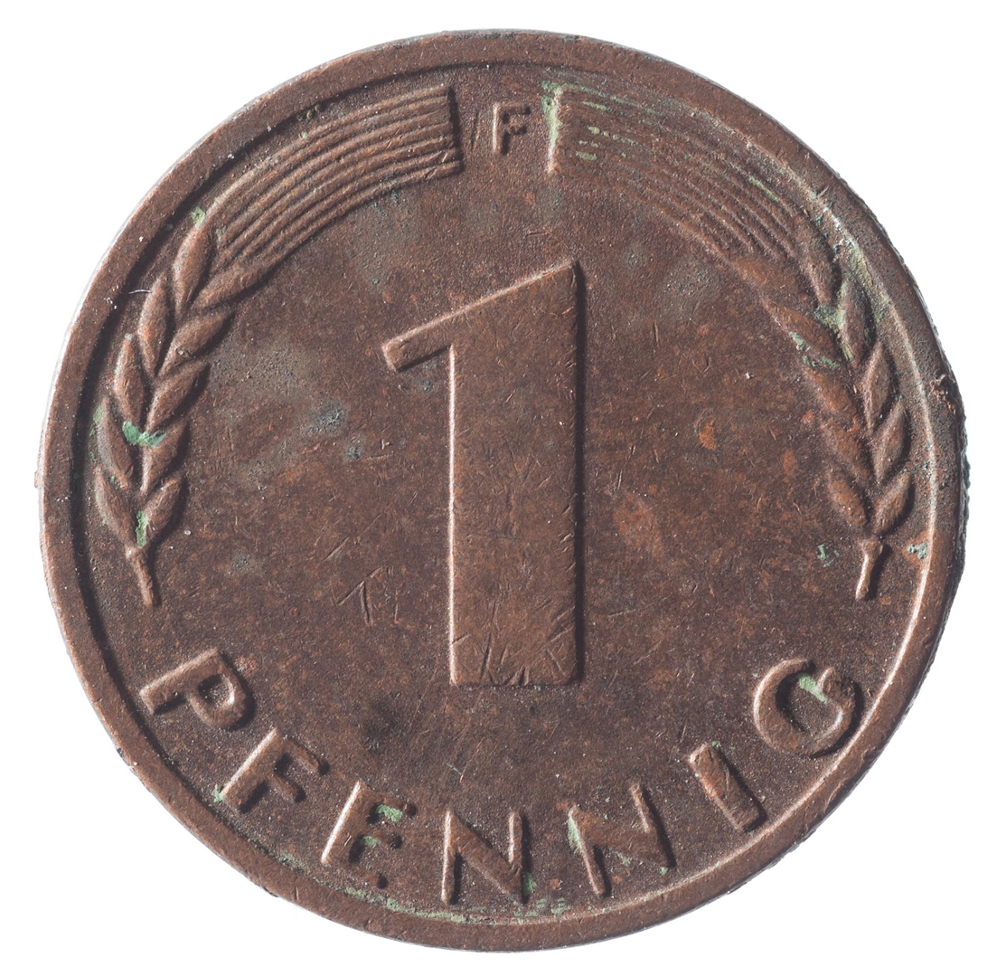 U sredini broj 1. Na vrhu slovo F (oznaka kovnice), a uz donji rub riječ PFENNIG.