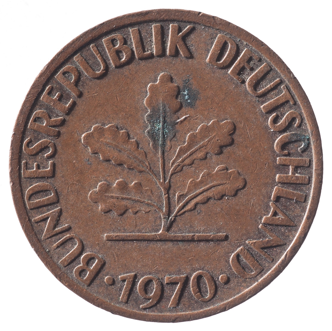 U sredini mladica hrasta s pet listova u vodoravnoj liniji. Uz rub ispisan tekst BUNDESREPUBLIK DEUTSCHLAND i godina 1970.