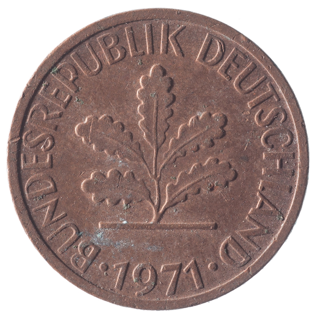 U sredini mladica hrasta s pet listova u vodoravnoj liniji. Uz rub ispisan tekst BUNDESREPUBLIK DEUTSCHLAND i godina 1971.