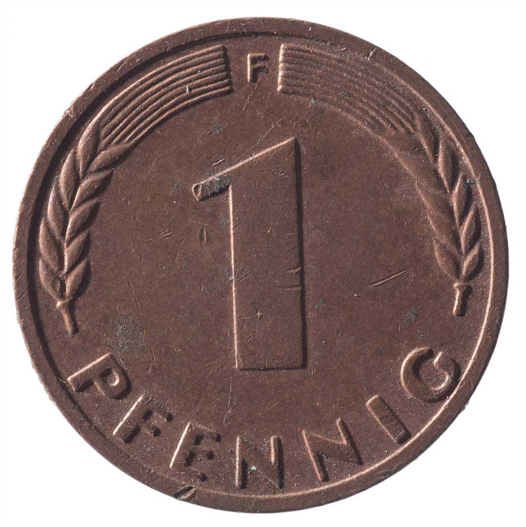 U sredini broj 1. Na vrhu slovo F (oznaka kovnice), a uz donji rub riječ PFENNIG.