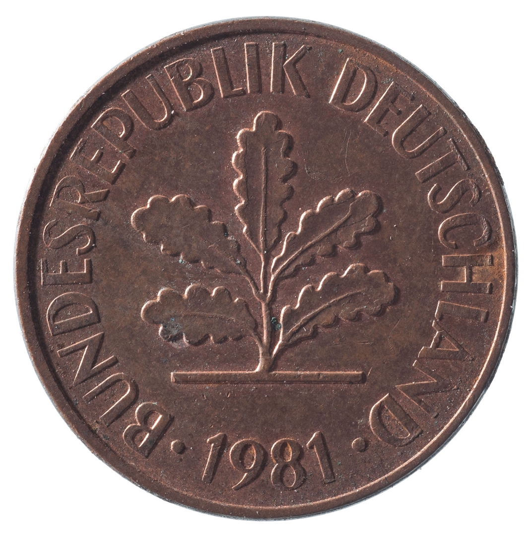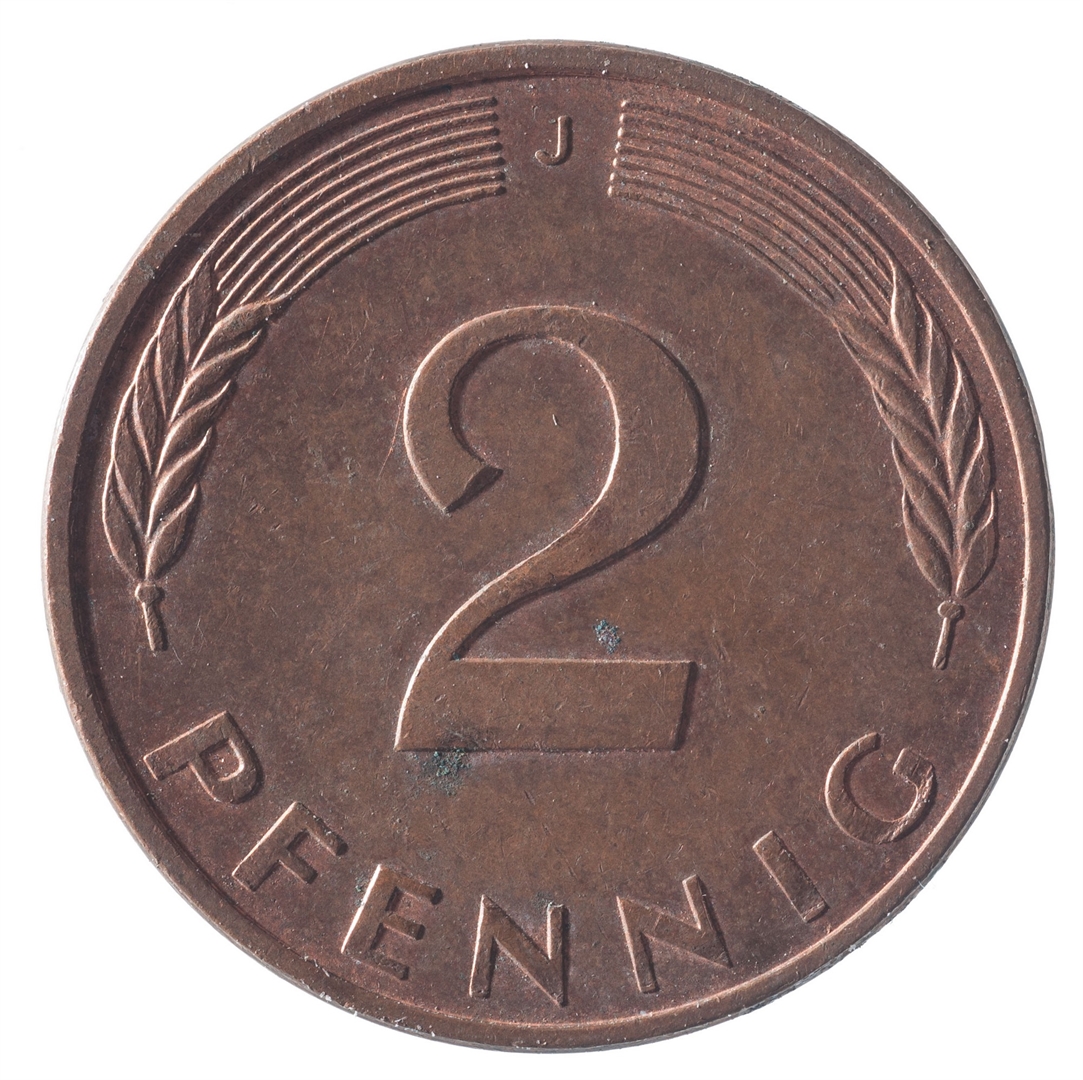 Avers: U sredini mladica hrasta s pet listova u vodoravnoj liniji. Uz rub ispisan tekst BUNDESREPUBLIK DEUTSCHLAND i godina 1981. Revers: U sredini broj 2. Na vrhu slovo J (oznaka kovnice), a uz donji rub riječ PFENNIG.