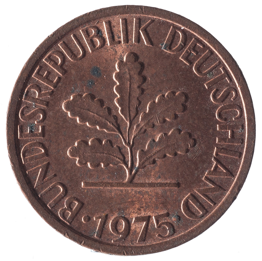 U sredini mladica hrasta s pet listova u vodoravnoj liniji. Uz rub ispisan tekst BUNDESREPUBLIK DEUTSCHLAND i godina 1975.
