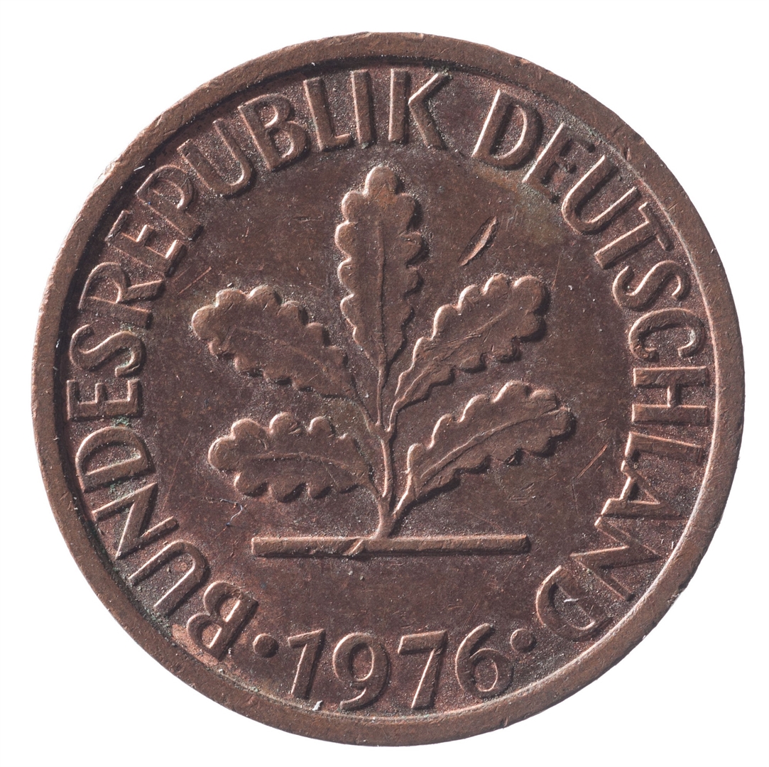 Avers: U sredini mladica hrasta s pet listova u vodoravnoj liniji. Uz rub ispisan tekst BUNDESREPUBLIK DEUTSCHLAND i godina 1976. Revers: U sredini broj 1. Na vrhu slovo D (oznaka kovnice), a uz donji rub riječ PFENNIG.