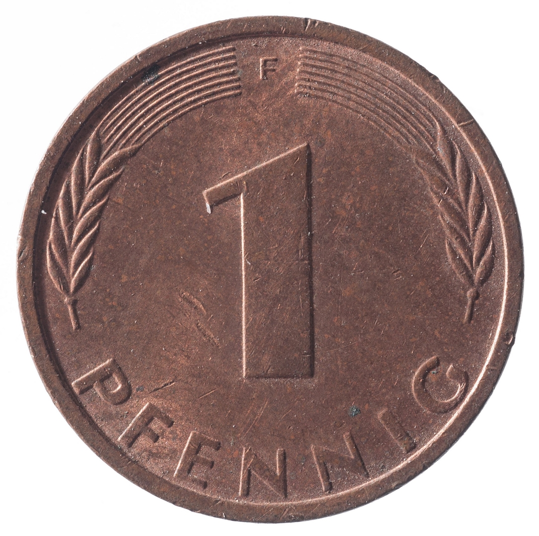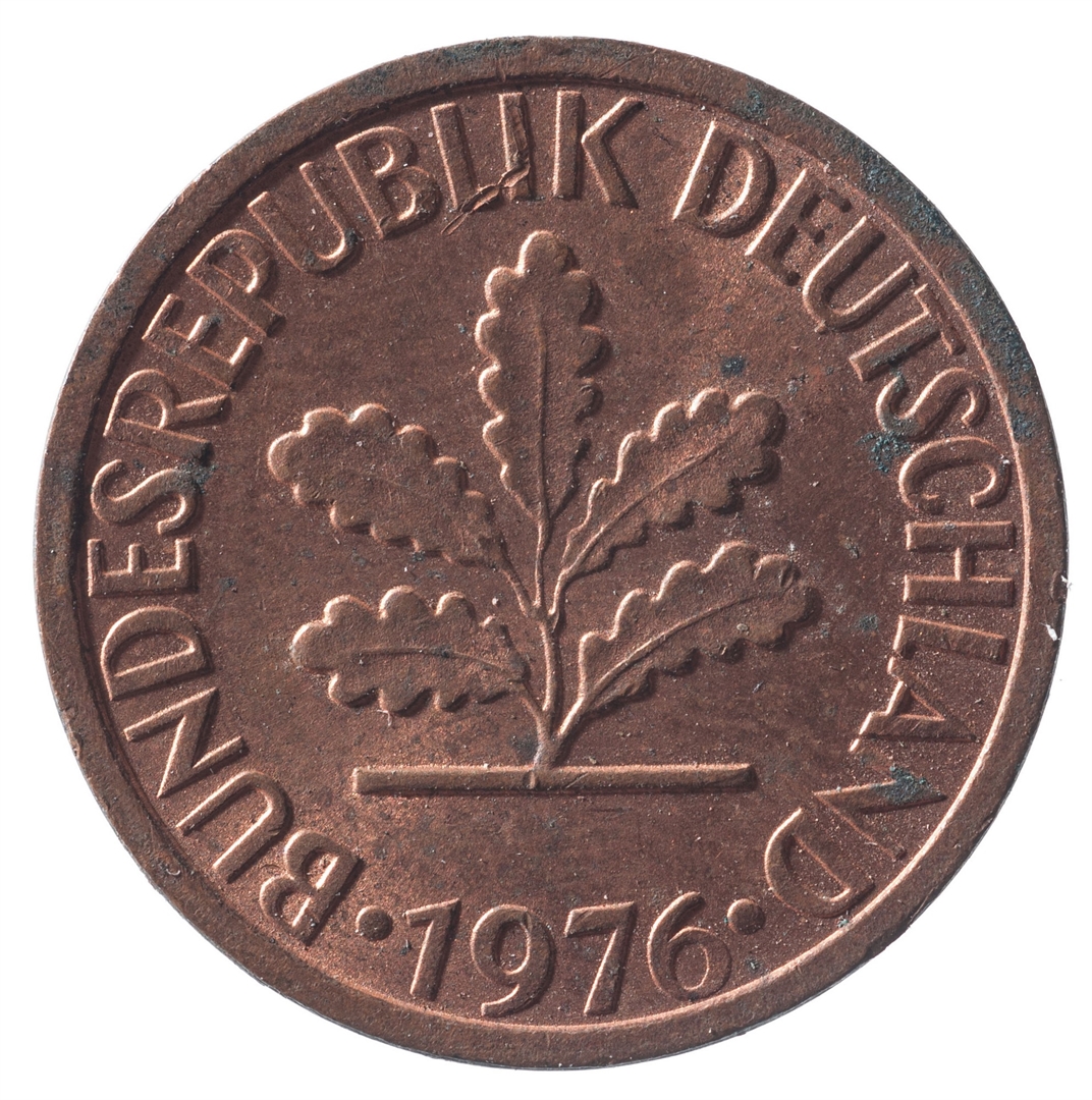 Avers: U sredini mladica hrasta s pet listova u vodoravnoj liniji. Uz rub ispisan tekst BUNDESREPUBLIK DEUTSCHLAND i godina 1976. Revers: U sredini broj 1. Na vrhu slovo F (oznaka kovnice), a uz donji rub riječ PFENNIG.