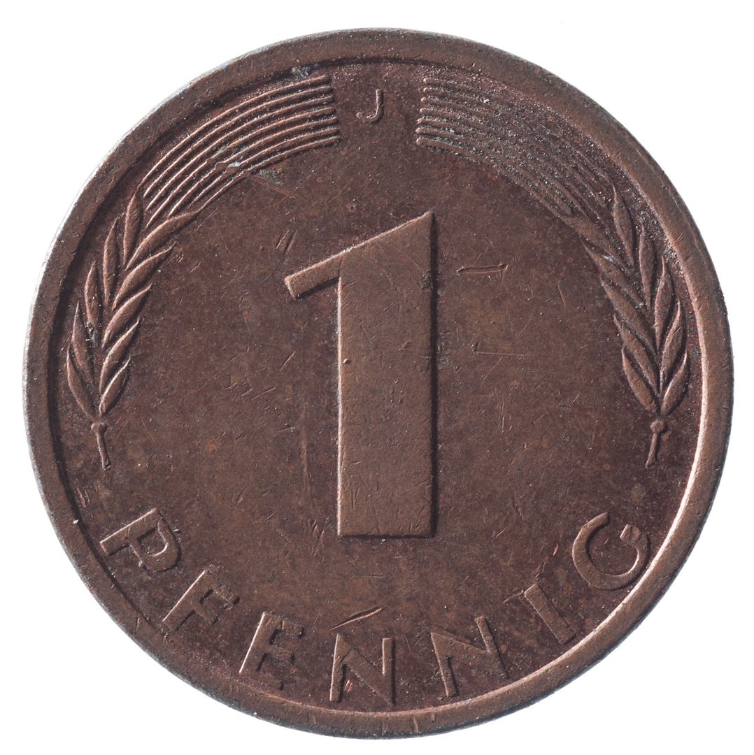 U sredini broj 1. Na vrhu slovo J (oznaka kovnice), a uz donji rub riječ PFENNIG.