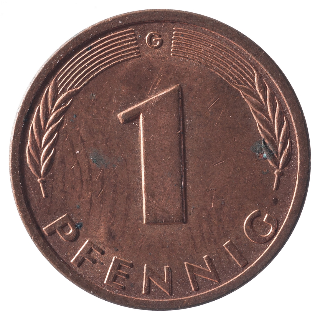 Avers: U sredini mladica hrasta s pet listova u vodoravnoj liniji. Uz rub ispisan tekst BUNDESREPUBLIK DEUTSCHLAND i godina 1979. Revers: U sredini broj 1. Na vrhu slovo G (oznaka kovnice), a uz donji rub riječ PFENNIG.