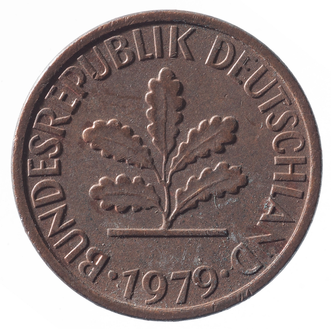 U sredini mladica hrasta s pet listova u vodoravnoj liniji. Uz rub ispisan tekst BUNDESREPUBLIK DEUTSCHLAND i godina 1979.