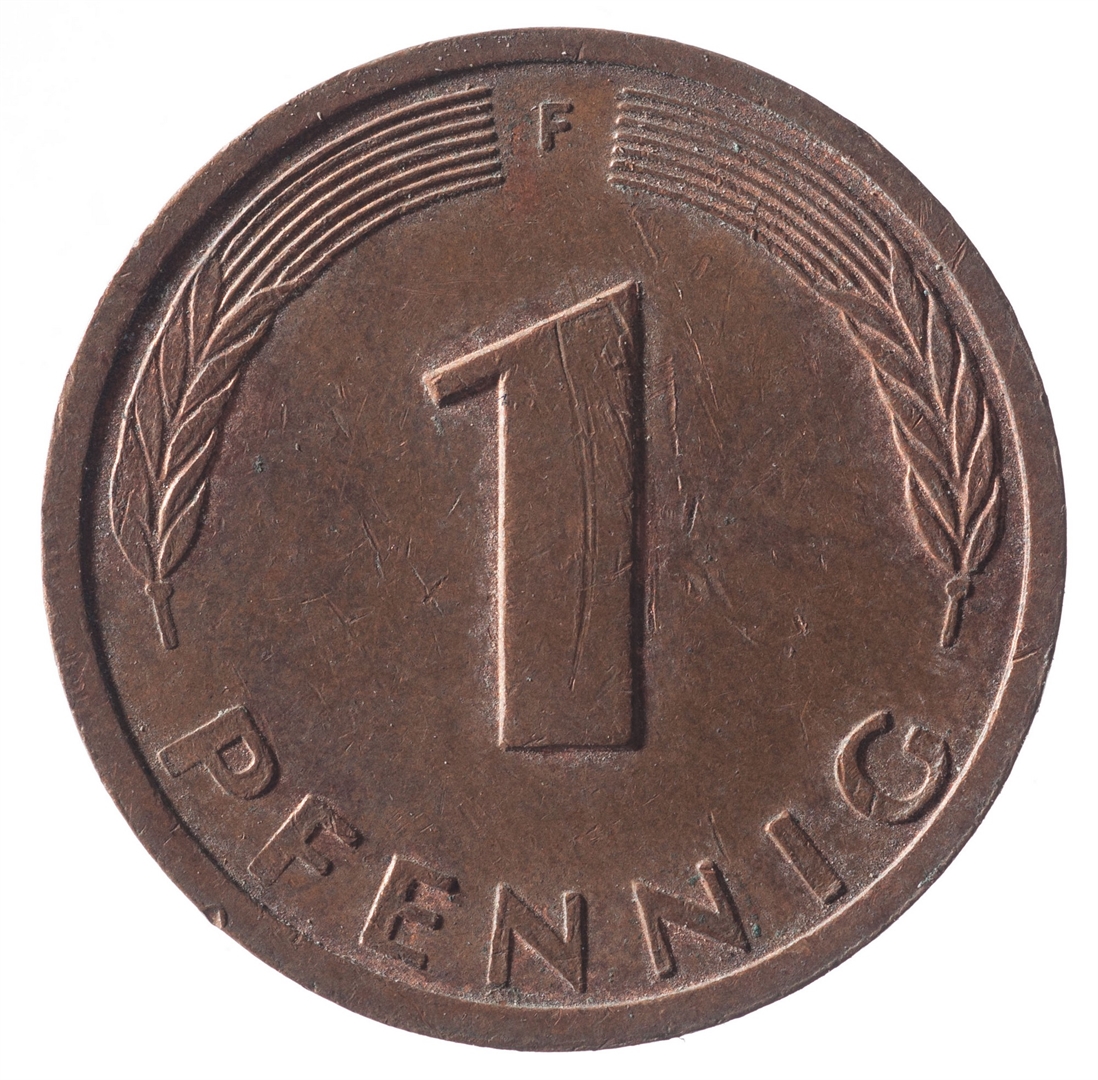 Avers: U sredini mladica hrasta s pet listova u vodoravnoj liniji. Uz rub ispisan tekst BUNDESREPUBLIK DEUTSCHLAND i godina 1980. Revers: U sredini broj 1. Na vrhu slovo F (oznaka kovnice), a uz donji rub riječ PFENNIG.