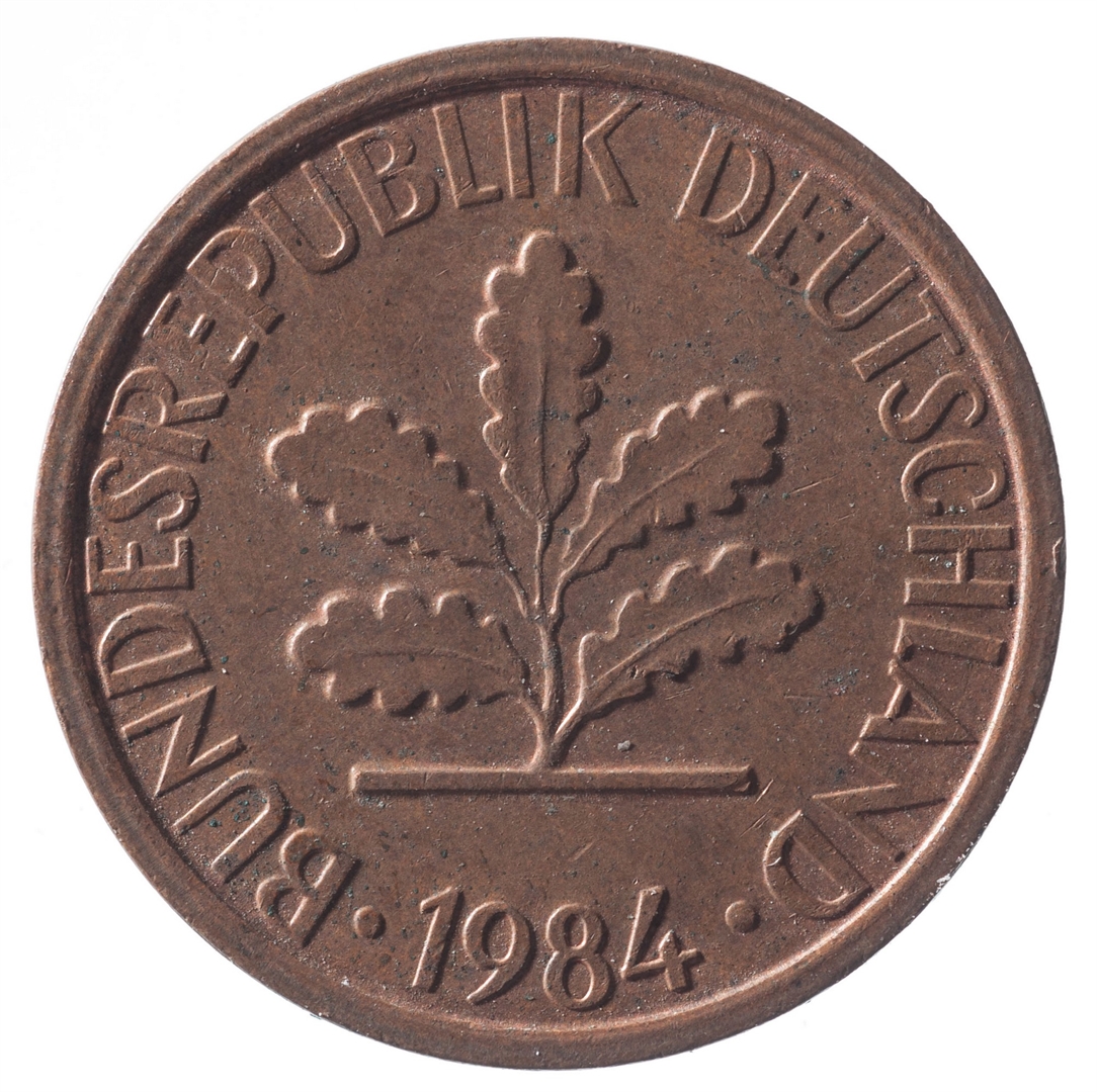 U sredini mladica hrasta s pet listova u vodoravnoj liniji. Uz rub ispisan tekst BUNDESREPUBLIK DEUTSCHLAND i godina 1984.