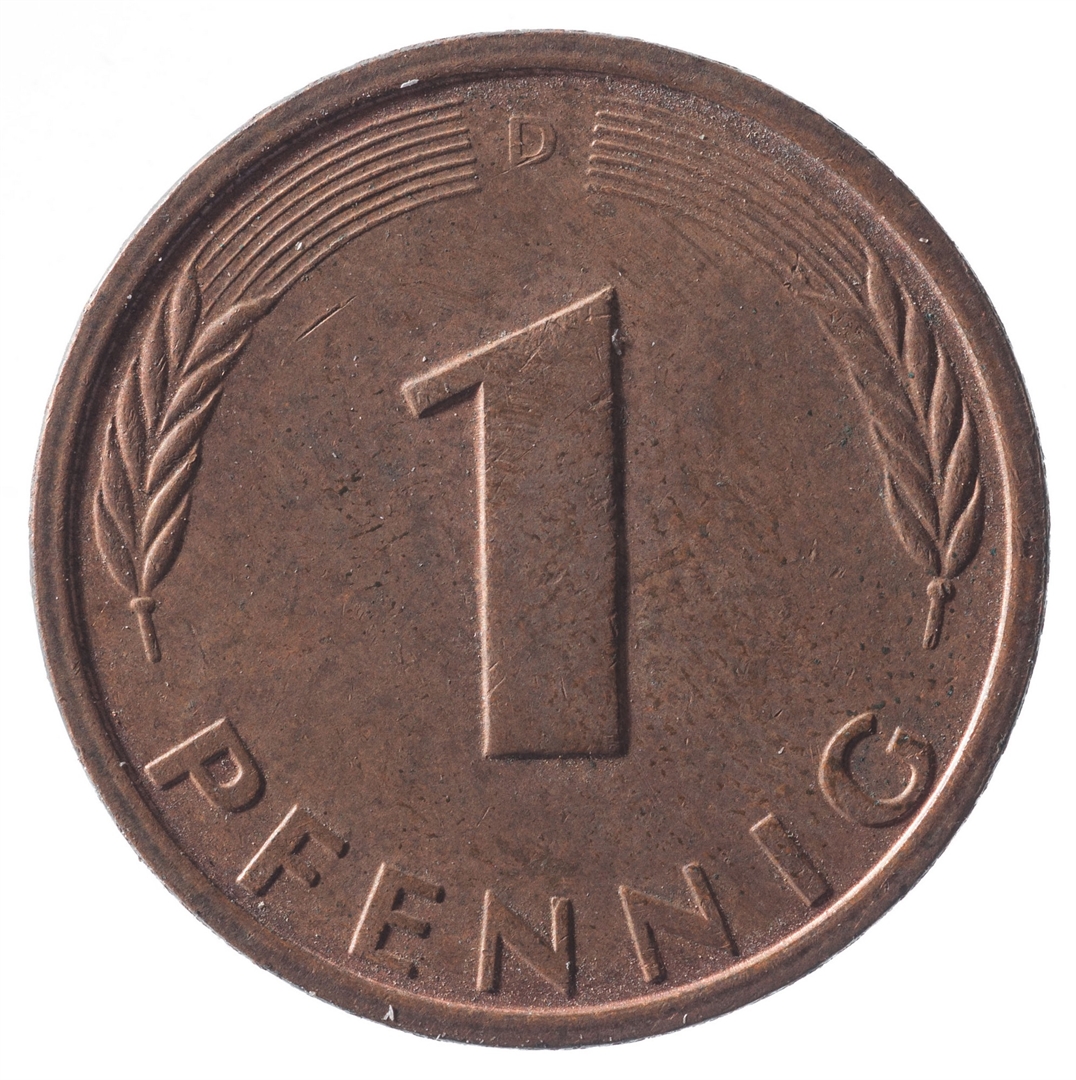 U sredini broj 1. Na vrhu slovo D (oznaka kovnice), a uz donji rub riječ PFENNIG.