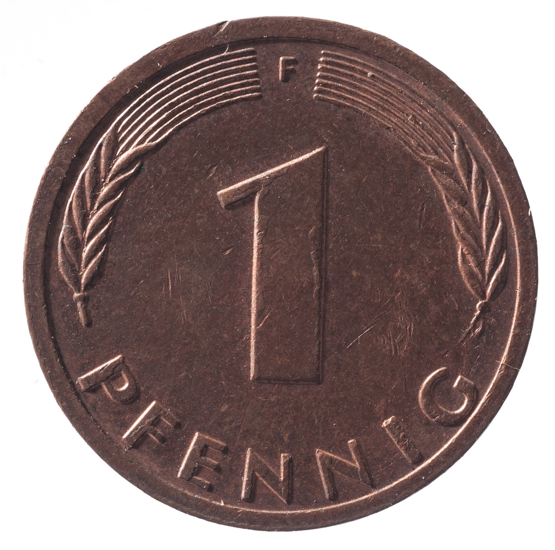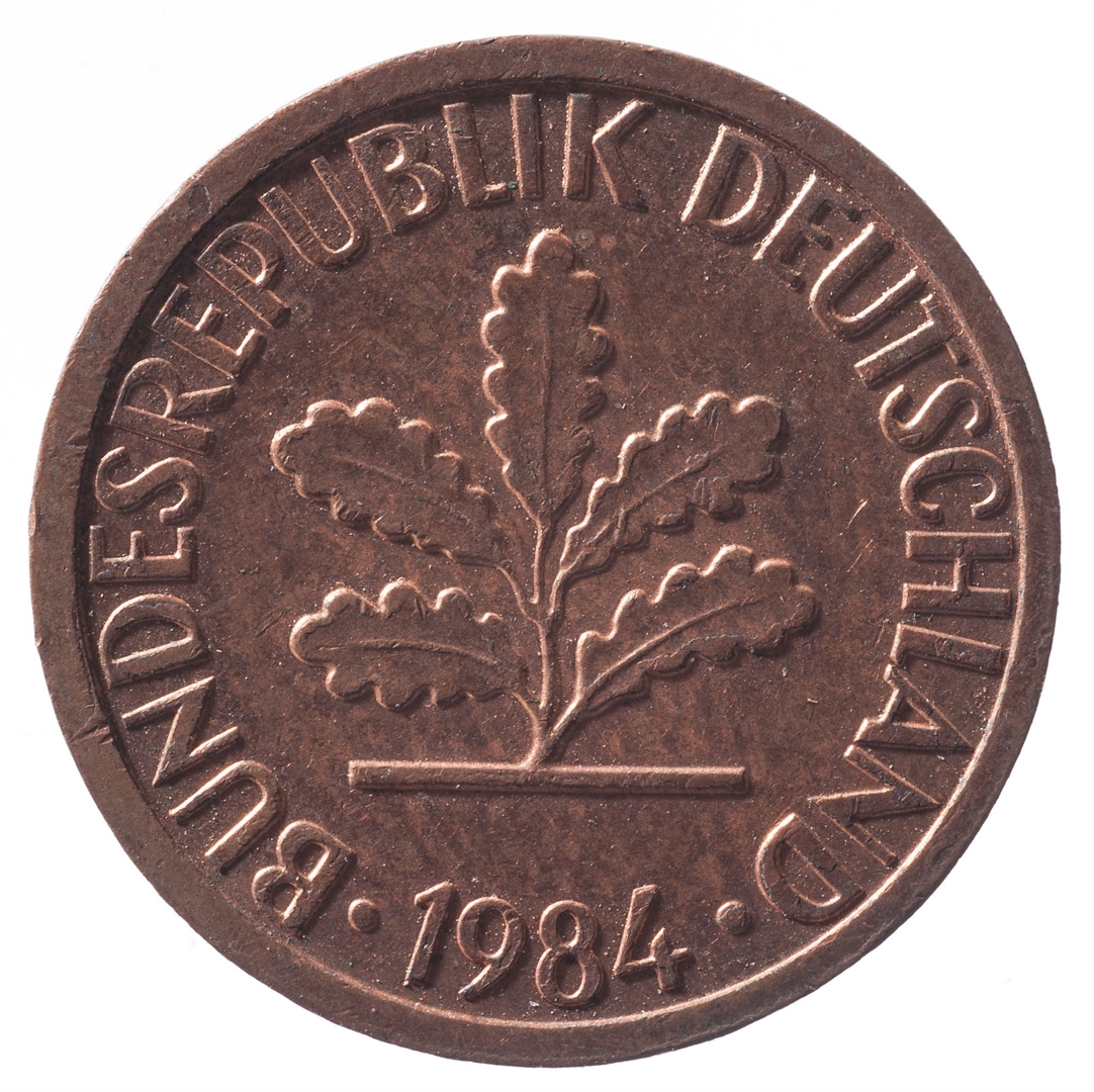 Avers: U sredini mladica hrasta s pet listova u vodoravnoj liniji. Uz rub ispisan tekst BUNDESREPUBLIK DEUTSCHLAND i godina 1984. Revers: U sredini broj 1. Na vrhu slovo F (oznaka kovnice), a uz donji rub riječ PFENNIG