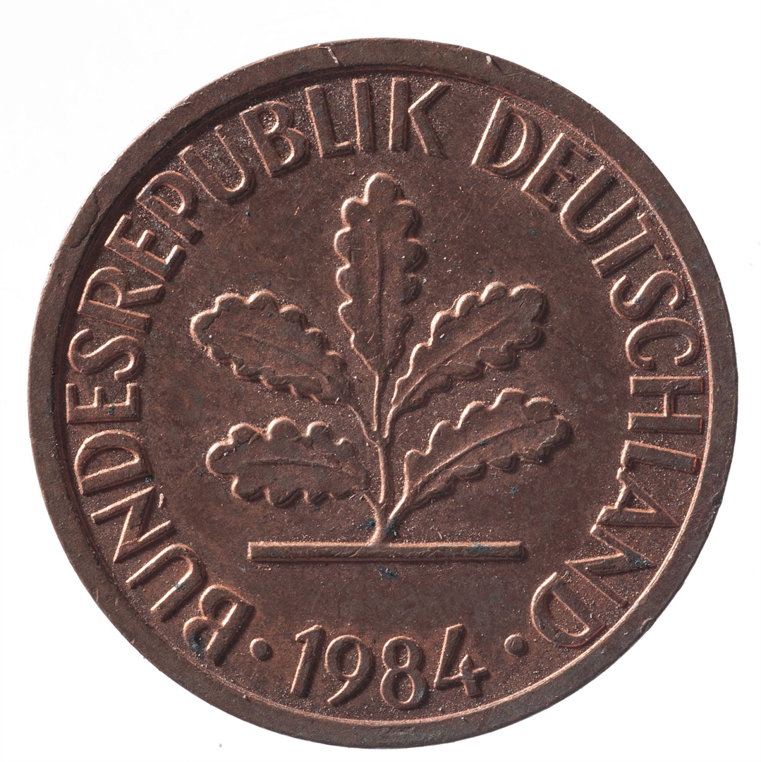U sredini mladica hrasta s pet listova u vodoravnoj liniji. Uz rub ispisan tekst BUNDESREPUBLIK DEUTSCHLAND i godina 1984.