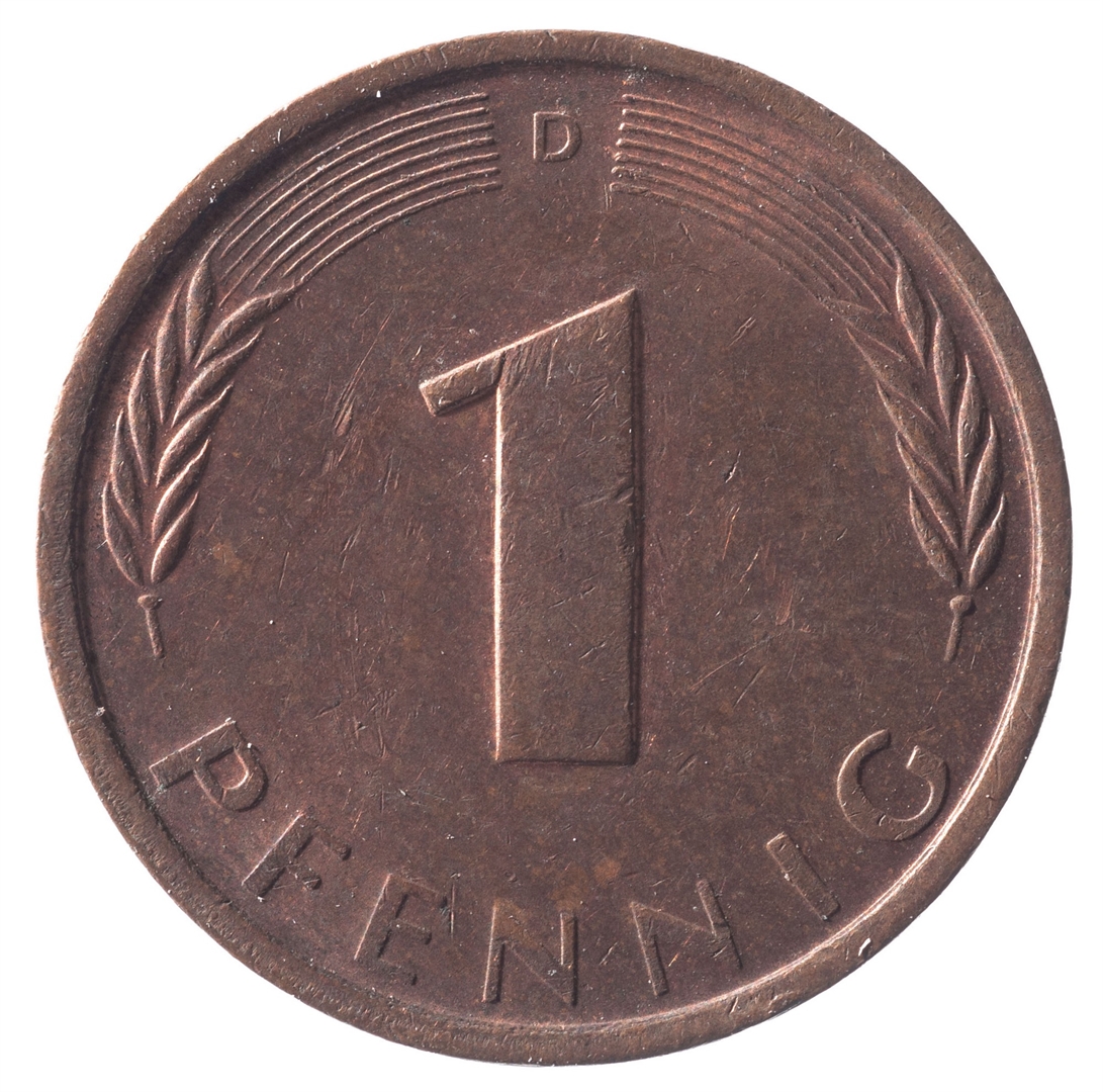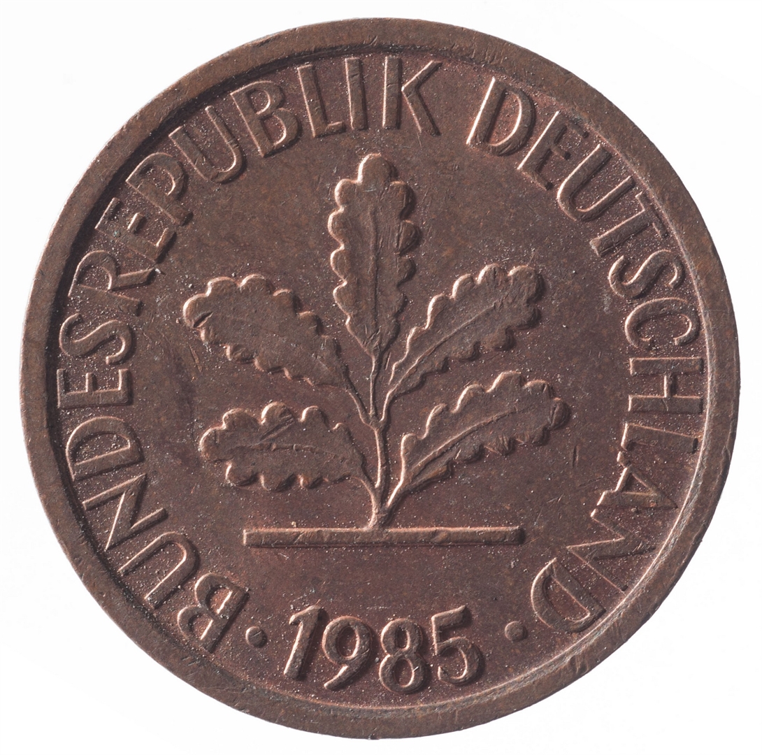 Avers: U sredini mladica hrasta s pet listova u vodoravnoj liniji. Uz rub ispisan tekst BUNDESREPUBLIK DEUTSCHLAND i godina 1985. Revers: U sredini broj 1. Na vrhu slovo D (oznaka kovnice), a uz donji rub riječ PFENNIG.