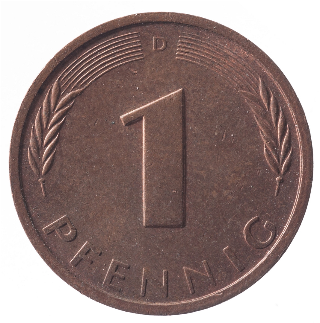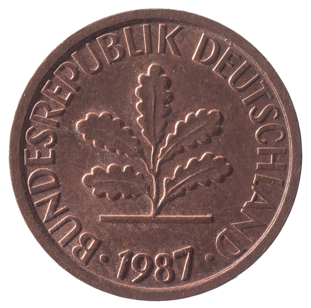 Avers: U sredini mladica hrasta s pet listova u vodoravnoj liniji. Uz rub ispisan tekst BUNDESREPUBLIK DEUTSCHLAND i godina 1987. Revers: U sredini broj 1. Na vrhu slovo D (oznaka kovnice), a uz donji rub riječ PFENNIG.