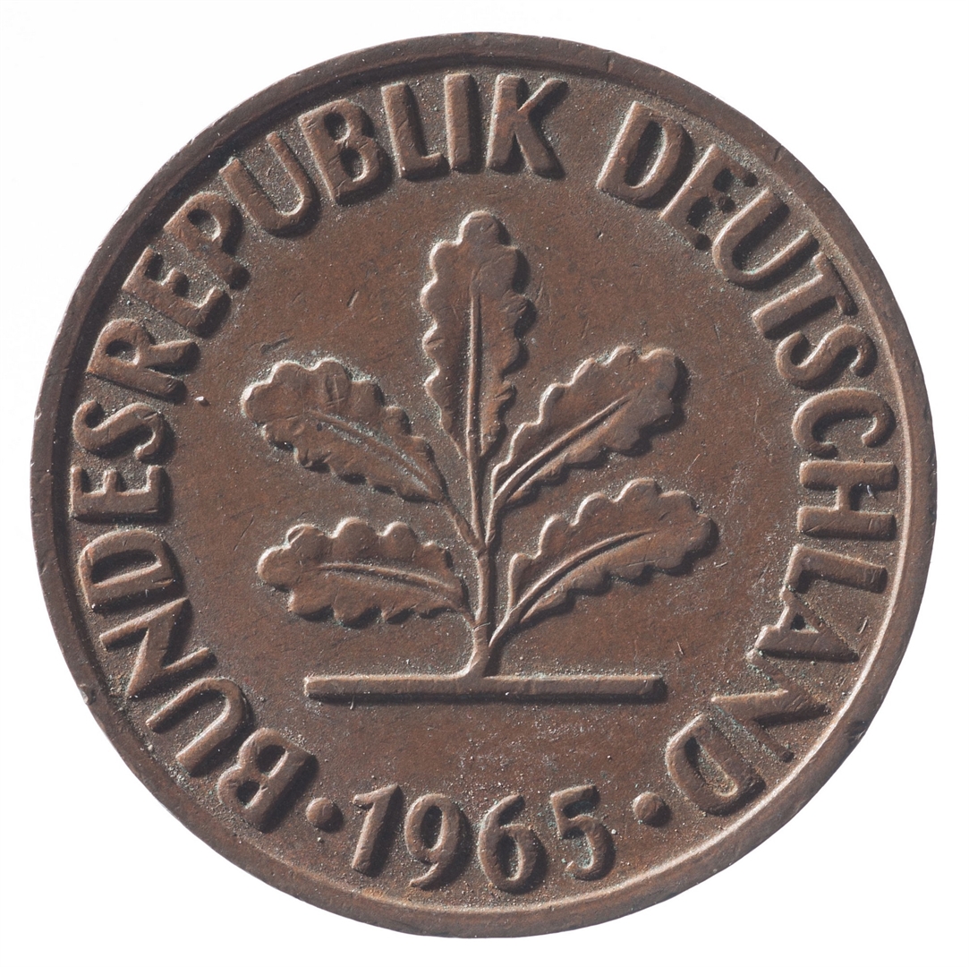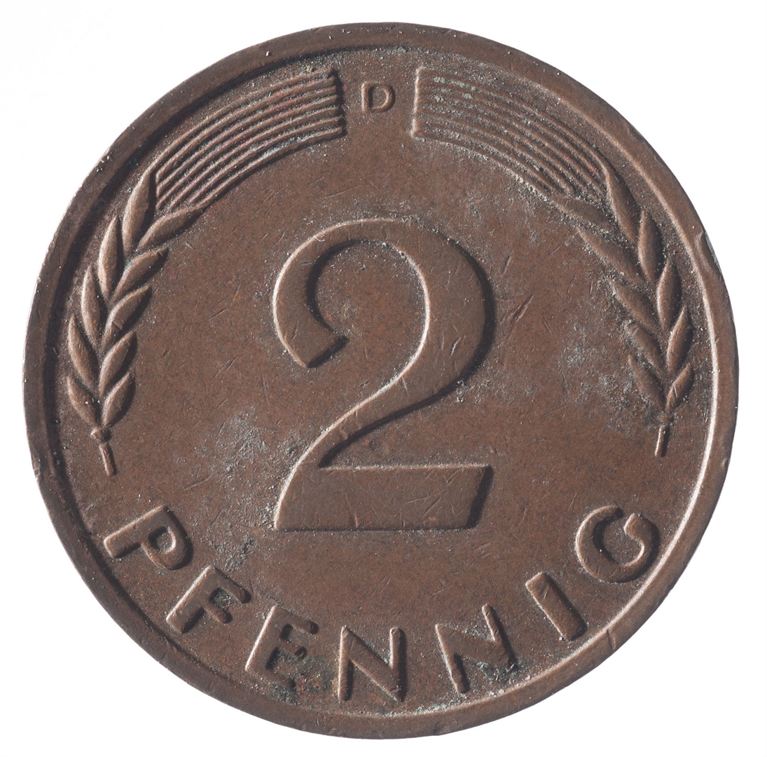 Avers: U sredini mladica hrasta s pet listova u vodoravnoj liniji. Uz rub ispisan tekst BUNDESREPUBLIK DEUTSCHLAND i godina 1965. Revers: U sredini broj 2. Na vrhu slovo D (oznaka kovnice), a uz donji rub riječ PFENNIG.