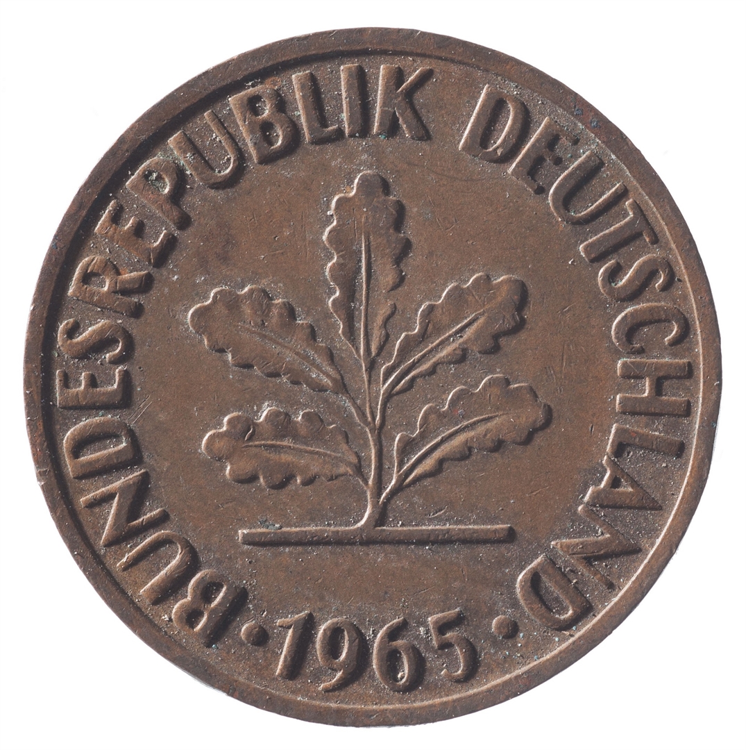 U sredini mladica hrasta s pet listova u vodoravnoj liniji. Uz rub ispisan tekst BUNDESREPUBLIK DEUTSCHLAND i godina 1965.