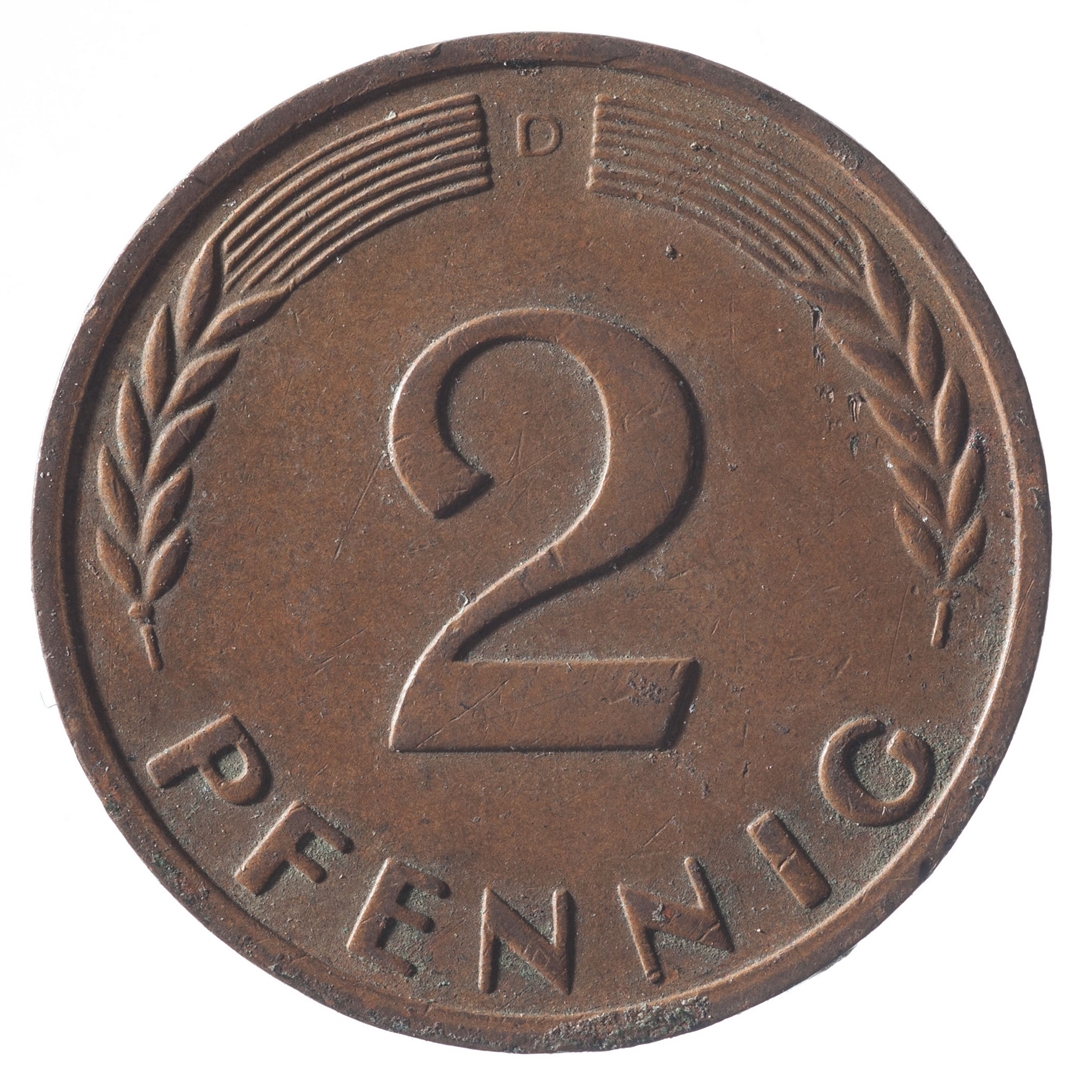U sredini broj 2. Na vrhu slovo D (oznaka kovnice), a uz donji rub riječ PFENNIG.