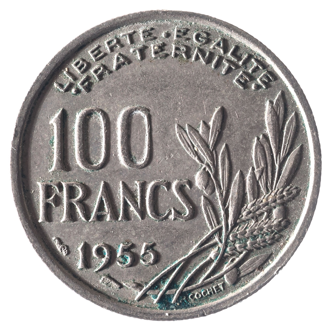 Avers: Profil Slobode okrenute udesno koja u ruci drži baklju. Uzdesni rub novčanice natpis u dva reda REPUBLIQUE FRANCAISE CR Revers: Uz desni rub u tri reda natpis 100/FRANCS/1955, a na vrhu u dva reda natpis LIBERTE EGALITE/FRATERNITE. Uz desni rub dvije grančice masline i 3 klasa pšenice. Ispod toga natpis R COCHET.
