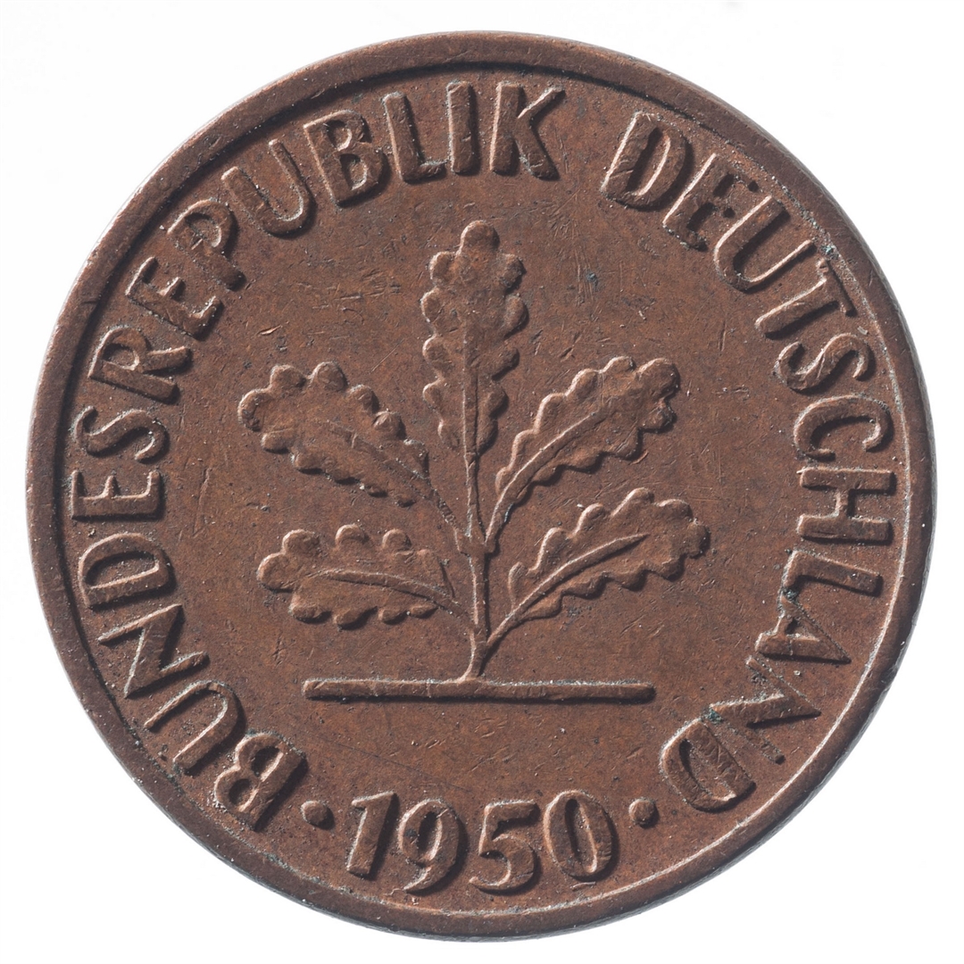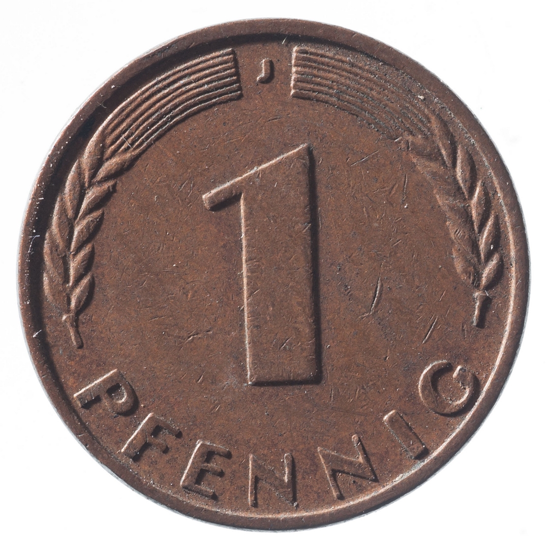 Avers: U sredini mladica hrasta s pet listova u vodoravnoj liniji. Uz rub ispisan tekst BUNDESREPUBLIK DEUTSCHLAND i godina 1950. Revers: U sredini broj 1. Na vrhu slovo J (oznaka kovnice), a uz donji rub riječ PFENNIG.