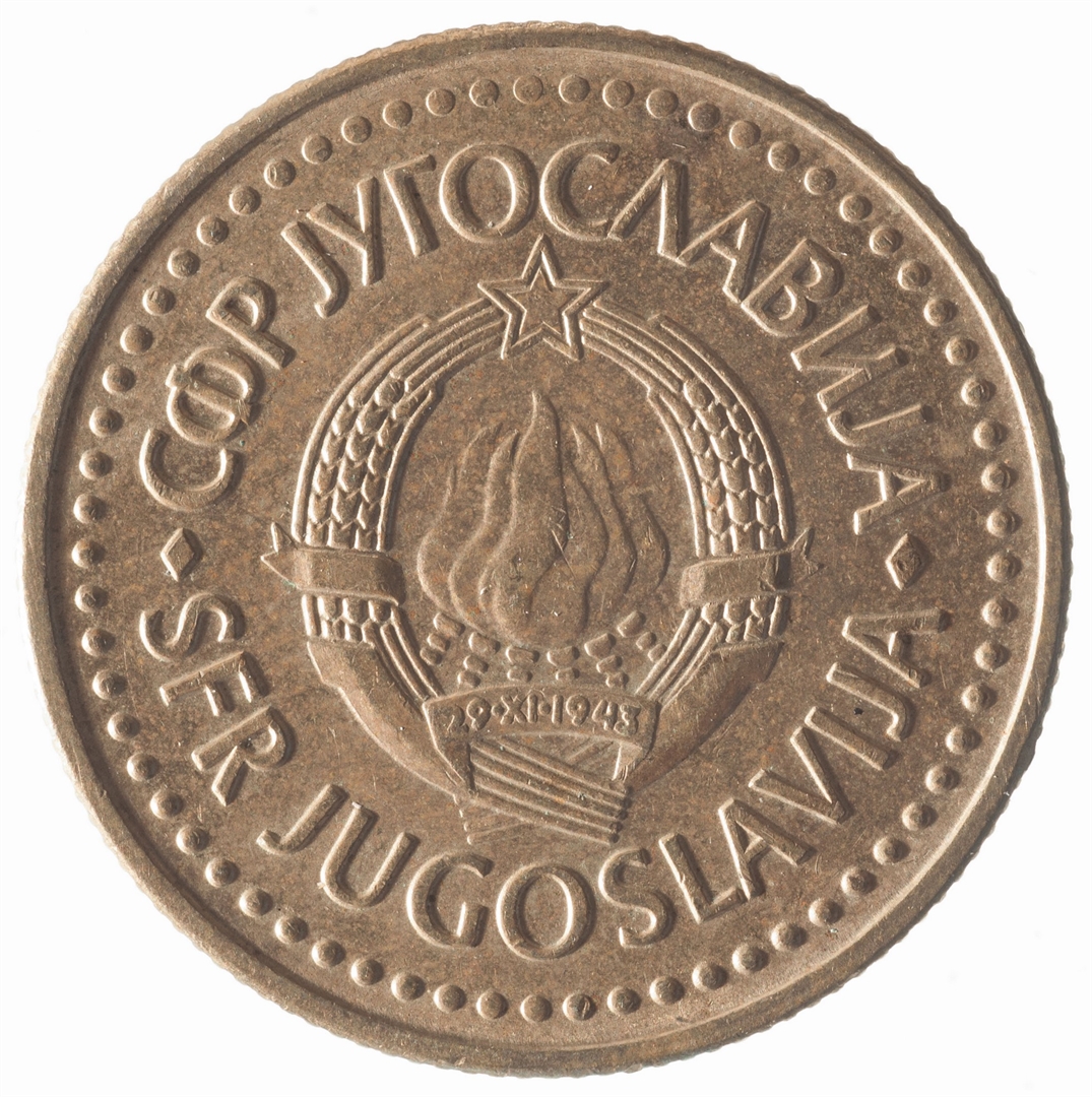 U sredini državni grb. Oko njega uz rub polukružno napisan tekst SFR JUGOSLAVIJA na latinici i ćirilici.
