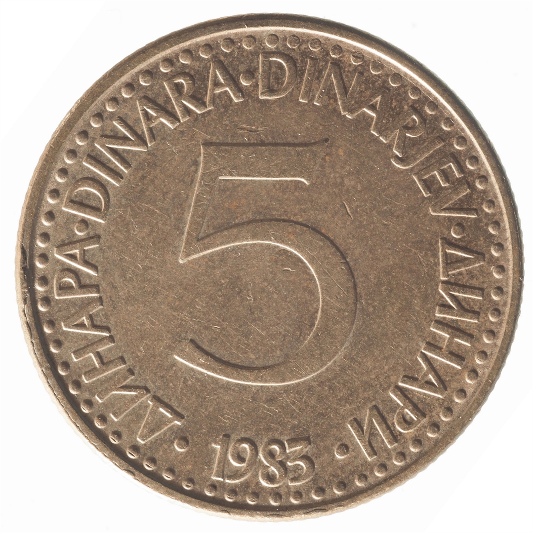 U sredini broj 5 (nominala), oko njega tekst DINAR na četiri jezika, a ispod toga godina 1983.