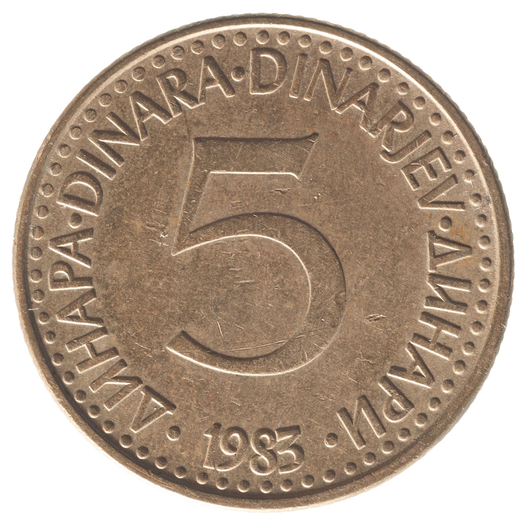 U sredini broj 5 (nominala), oko njega tekst DINAR na četiri jezika, a ispod toga godina 1983.