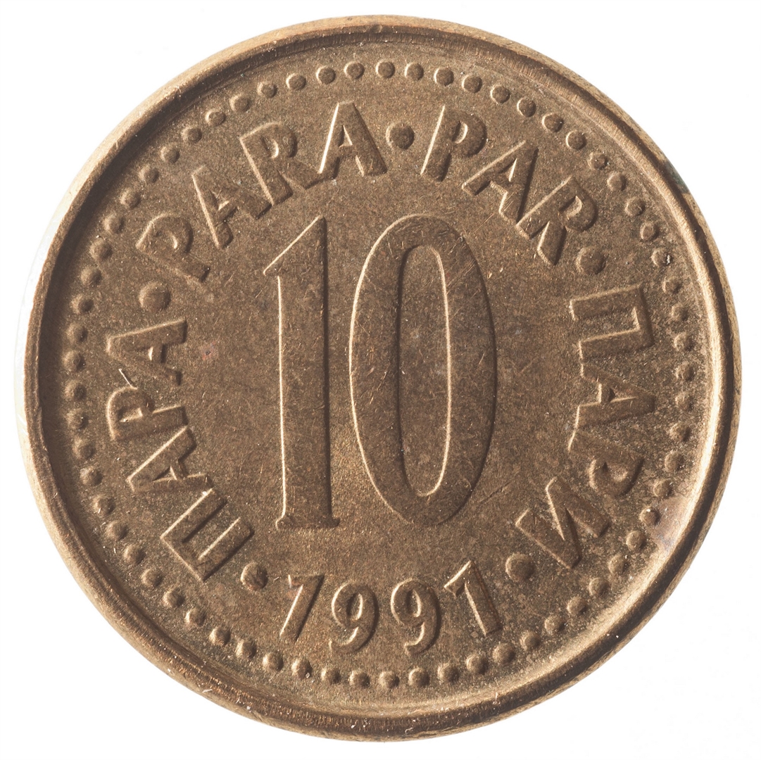 Avers: U sredini državni grb. U oko njega uz rub polukružno napisan tekst SFR JUGOSLAVIJA na latinici i ćirilici. Revers: U sredini broj 10 (nominala), oko njega tekst PARA na četiri jezika, a ispod toga godina 1991.