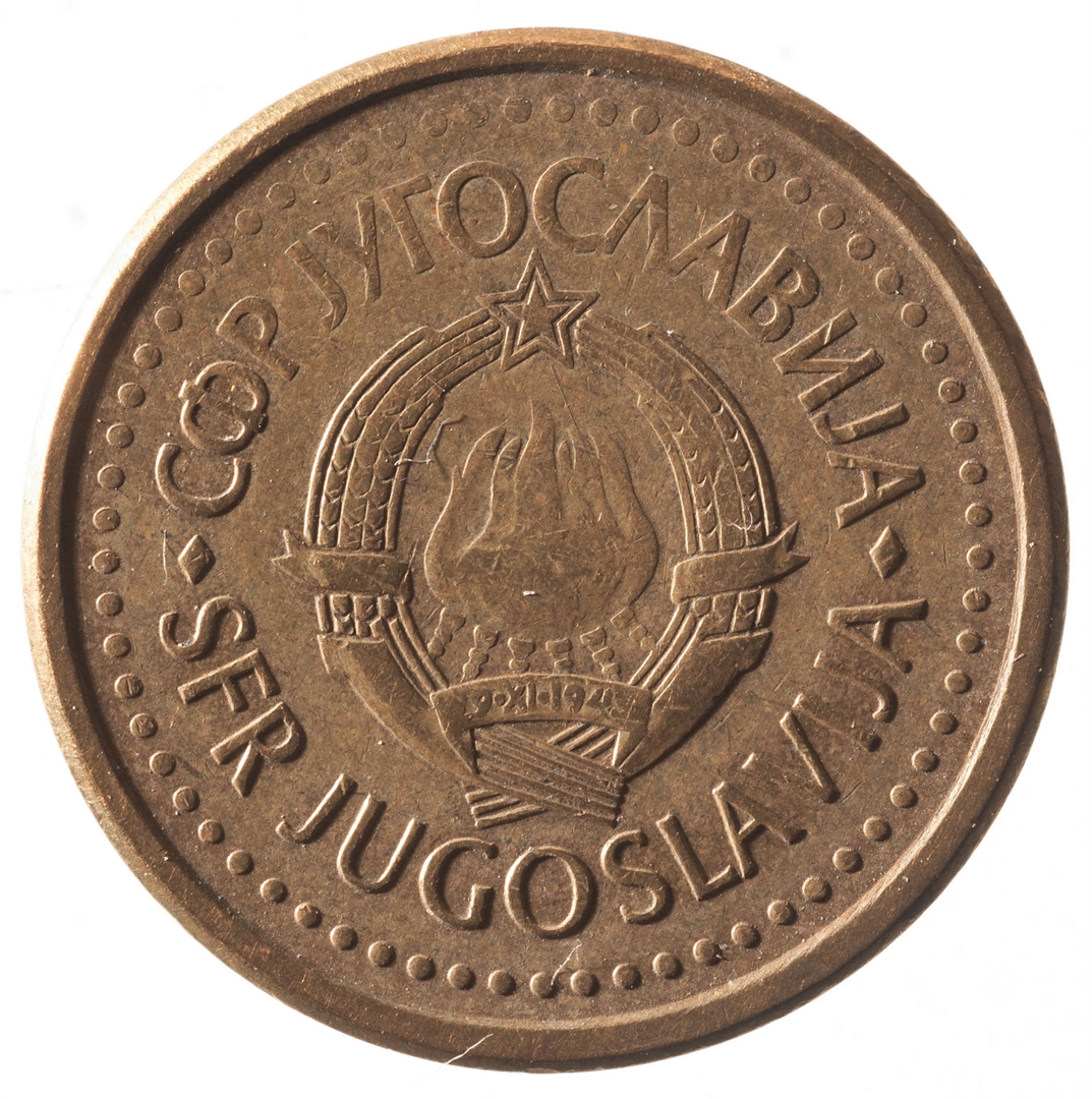 U sredini državni grb. U oko njega uz rub polukružno napisan tekst SFR JUGOSLAVIJA na latinici i ćirilici.