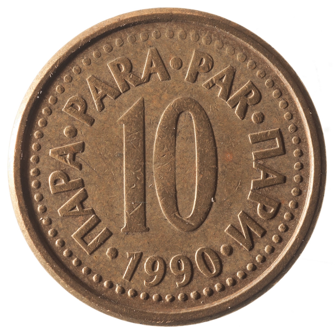 U sredini broj 10 (nominala), oko njega tekst PARA na četiri jezika, a ispod toga godina 1990.