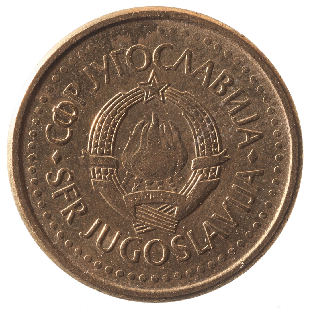 U sredini državni grb. U oko njega uz rub polukružno napisan tekst SFR JUGOSLAVIJA na latinici i ćirilici.