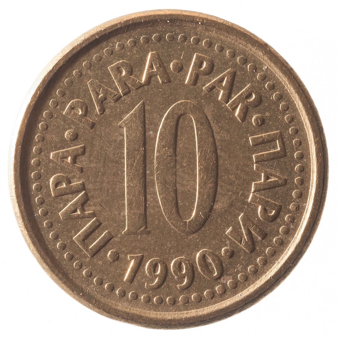 U sredini broj 10 (nominala), oko njega tekst PARA na četiri jezika, a ispod toga godina 1990.
