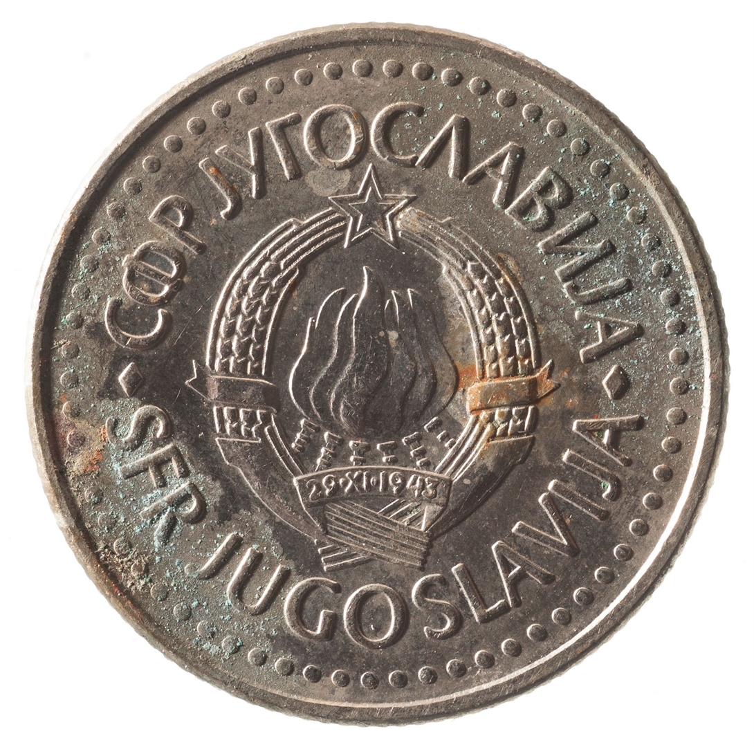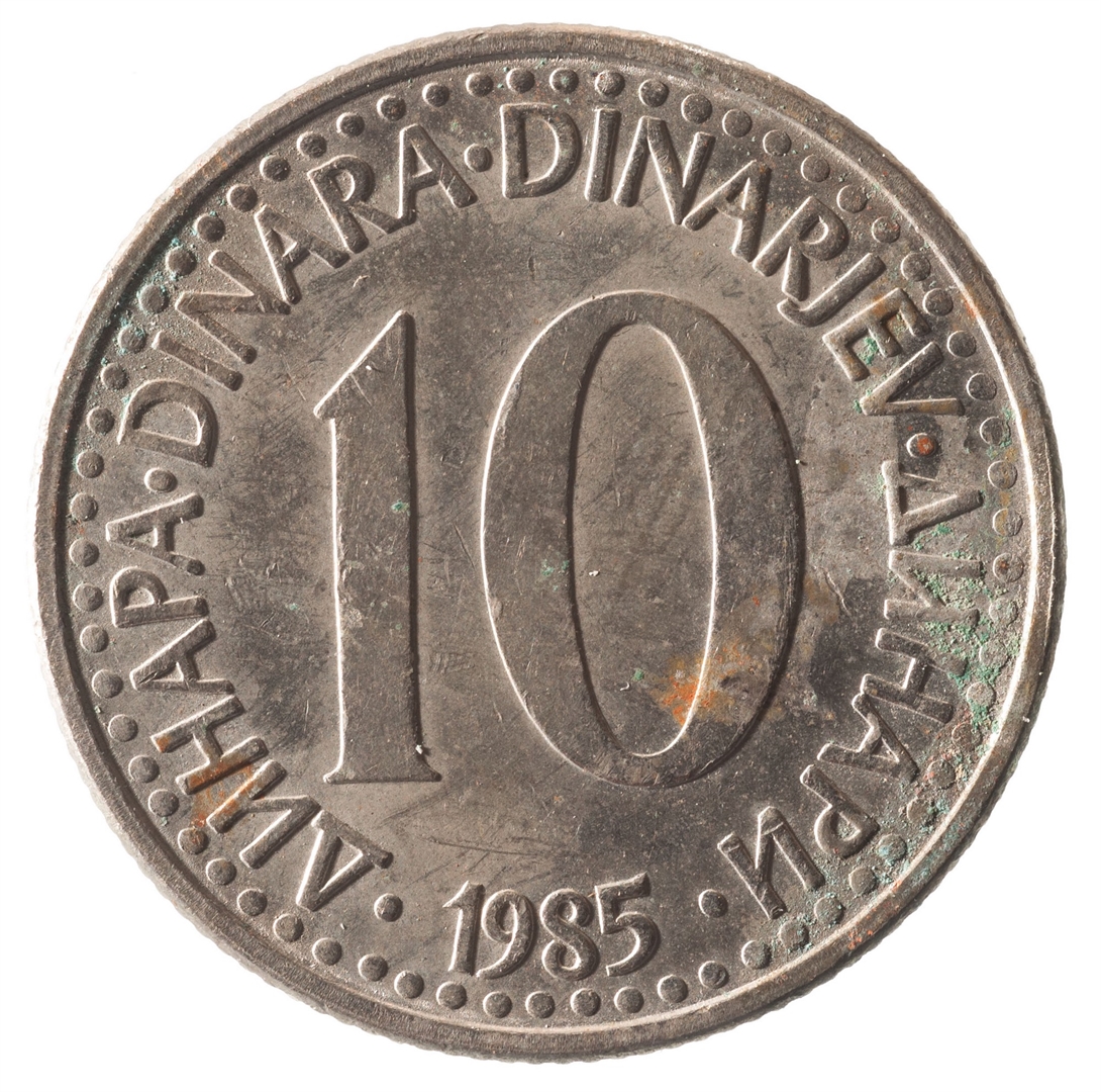 Avers: U sredini državni grb. Oko njega uz rub polukružno napisan tekst SFR JUGOSLAVIJA na latinici i ćirilici. Revers: U sredini broj 10 (nominala), oko njega tekst DINAR na četiri jezika, a ispod toga godina 1985.