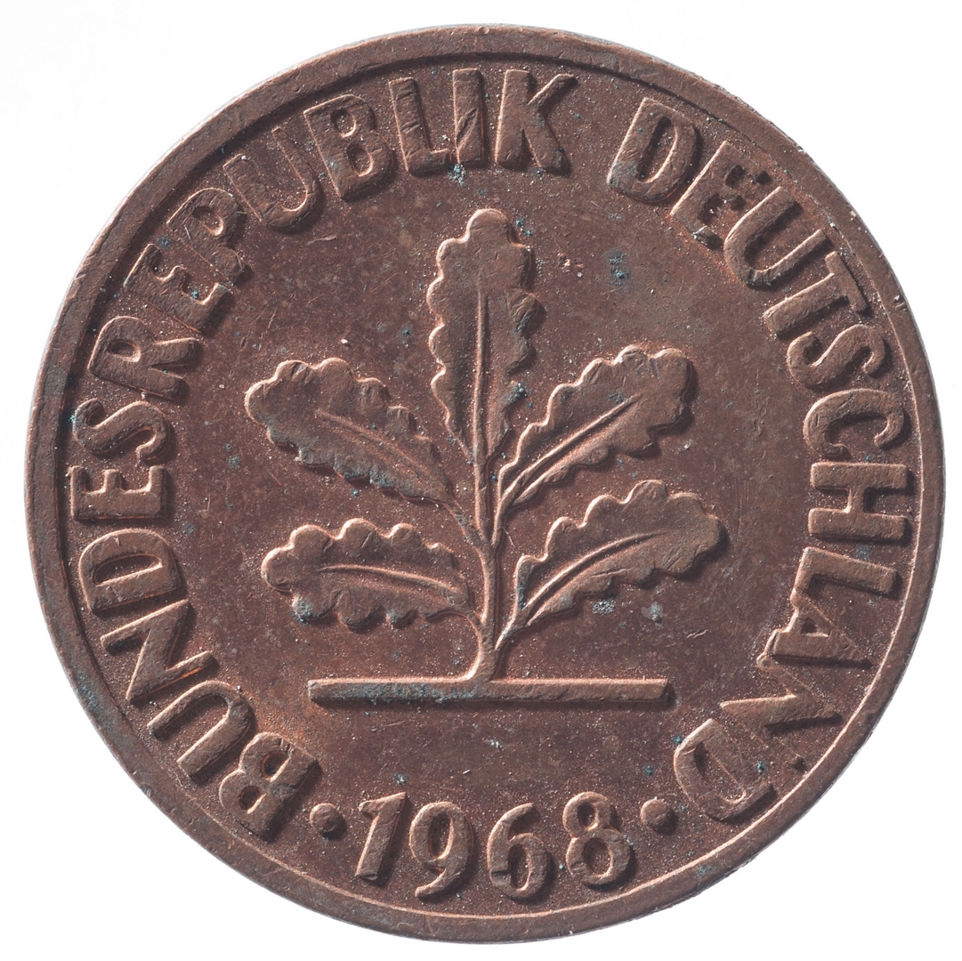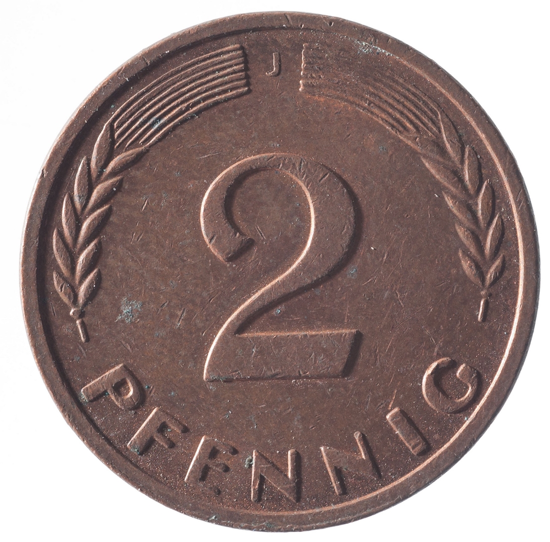 Avers: U sredini mladica hrasta s pet listova u vodoravnoj liniji. Uz rub ispisan tekst BUNDESREPUBLIK DEUTSCHLAND i godina 1968. Revers: U sredini broj 2. Na vrhu slovo J (oznaka kovnice), a uz donji rub riječ PFENNIG.