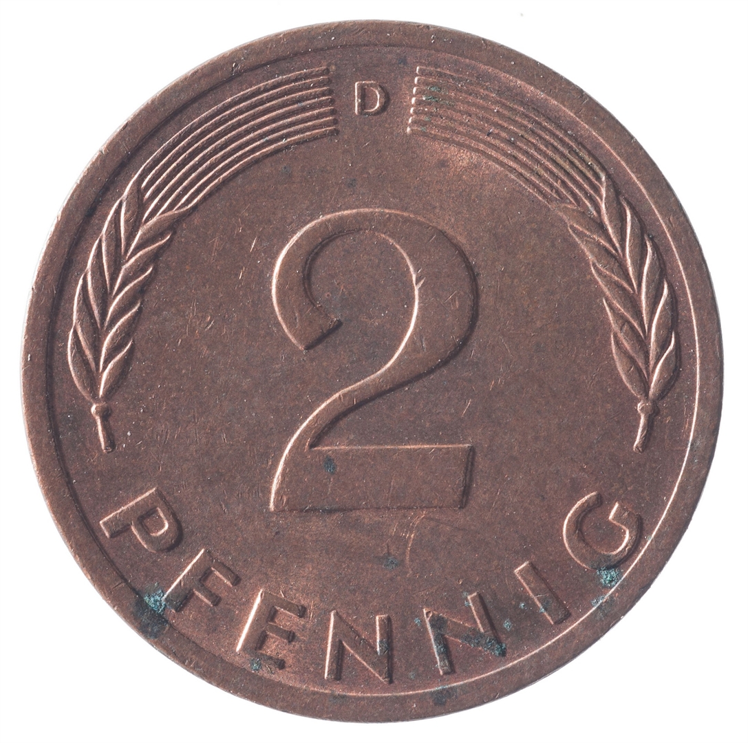 Avers: U sredini mladica hrasta s pet listova u vodoravnoj liniji. Uz rub ispisan tekst BUNDESREPUBLIK DEUTSCHLAND i godina 1976. Revers: U sredini broj 2. Na vrhu slovo D (oznaka kovnice), a uz donji rub riječ PFENNIG.