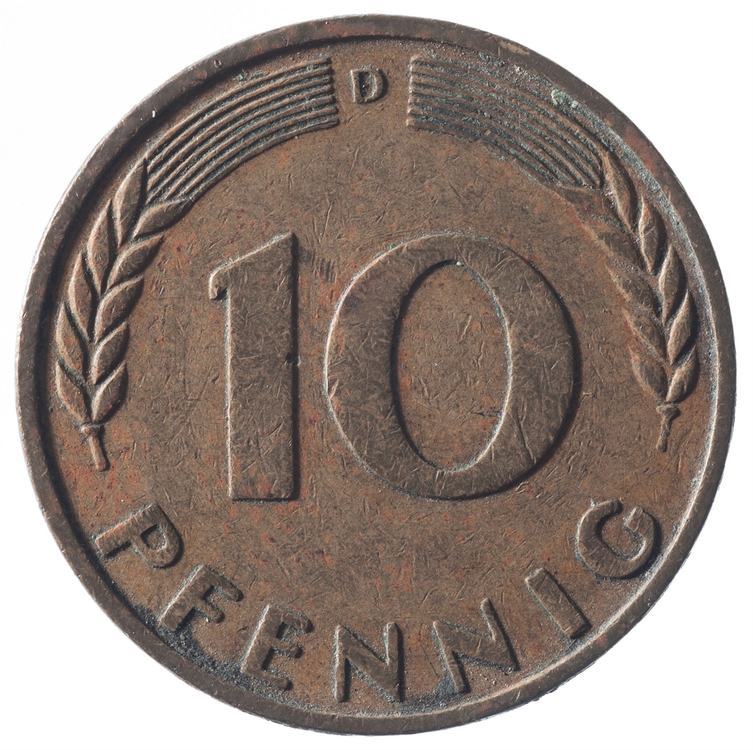 Avers: U sredini mladica hrasta s pet listova u vodoravnoj liniji. Uz rub ispisan tekst BUNDESREPUBLIK DEUTSCHLAND i godina 1950. Revers: U sredini broj 10. Na vrhu slovo D (oznaka kovnice), a uz donji rub riječ PFENNIG.