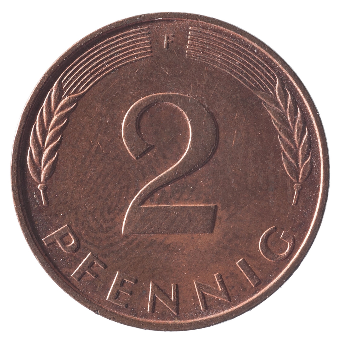 Avers: U sredini mladica hrasta s pet listova u vodoravnoj liniji. Uz rub ispisan tekst BUNDESREPUBLIK DEUTSCHLAND i godina 1990. Revers: U sredini broj 2. Na vrhu slovo F (oznaka kovnice), a uz donji rub riječ PFENNIG.