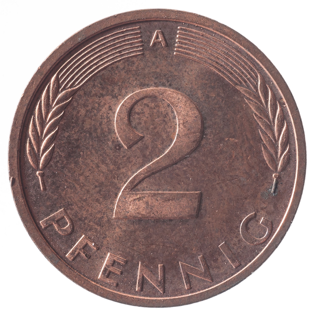 Avers: U sredini mladica hrasta s pet listova u vodoravnoj liniji. Uz rub ispisan tekst BUNDESREPUBLIK DEUTSCHLAND i godina 1992. Revers: U sredini broj 2. Na vrhu slovo A (oznaka kovnice), a uz donji rub riječ PFENNIG.