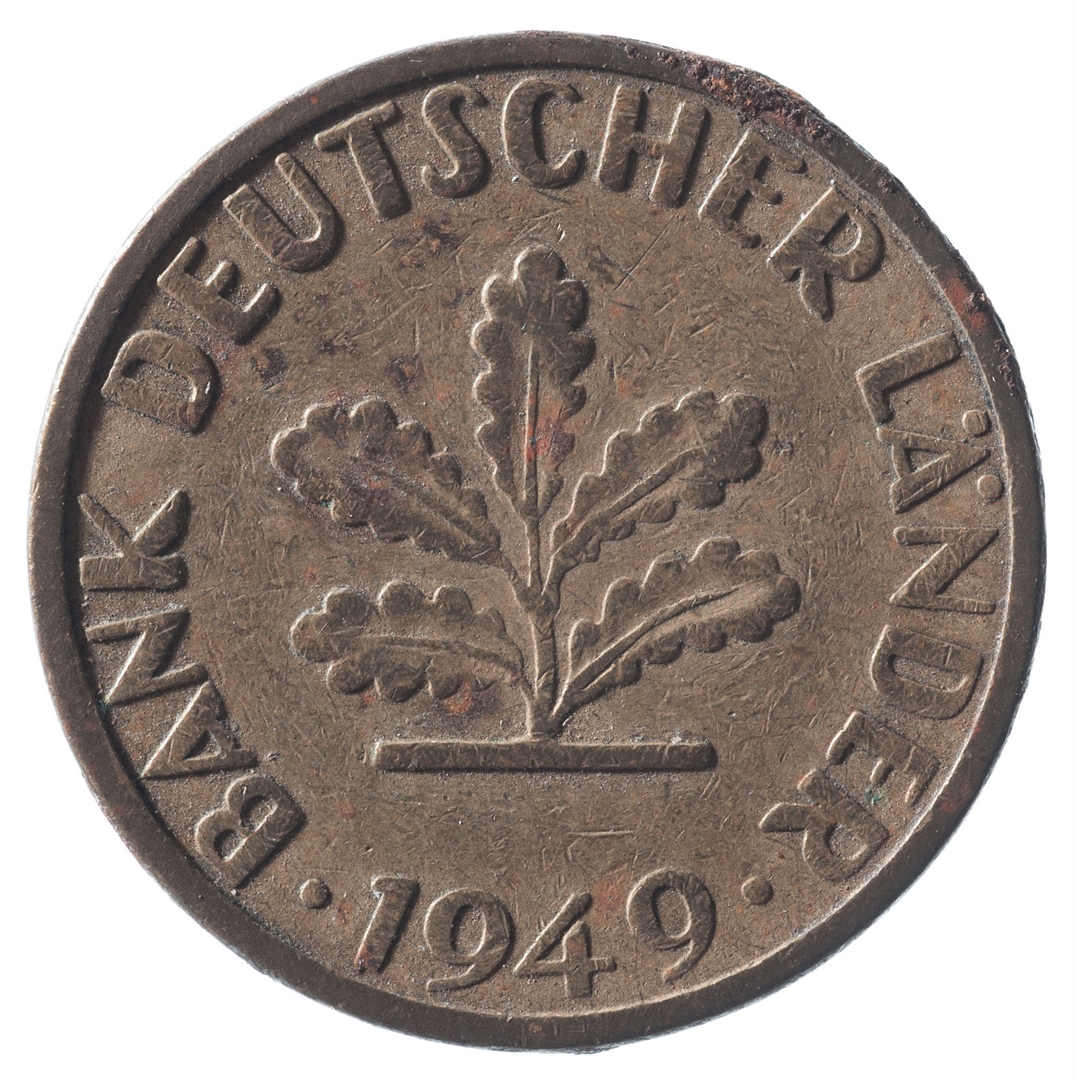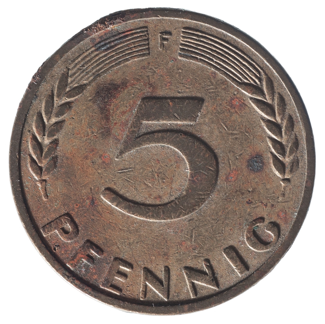 Avers: U sredini mladica hrasta s pet listova u vodoravnoj liniji. Uz rub ispisan tekst BANK DEUTSCHER LÄNDER i godina 1949. Revers: U sredini broj 5. Na vrhu slovo F (oznaka kovnice), a uz donji rub riječ PFENNIG.