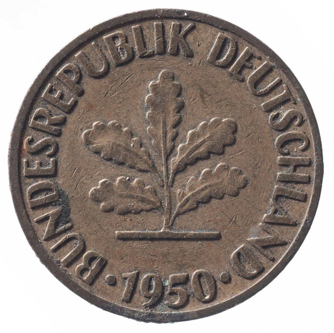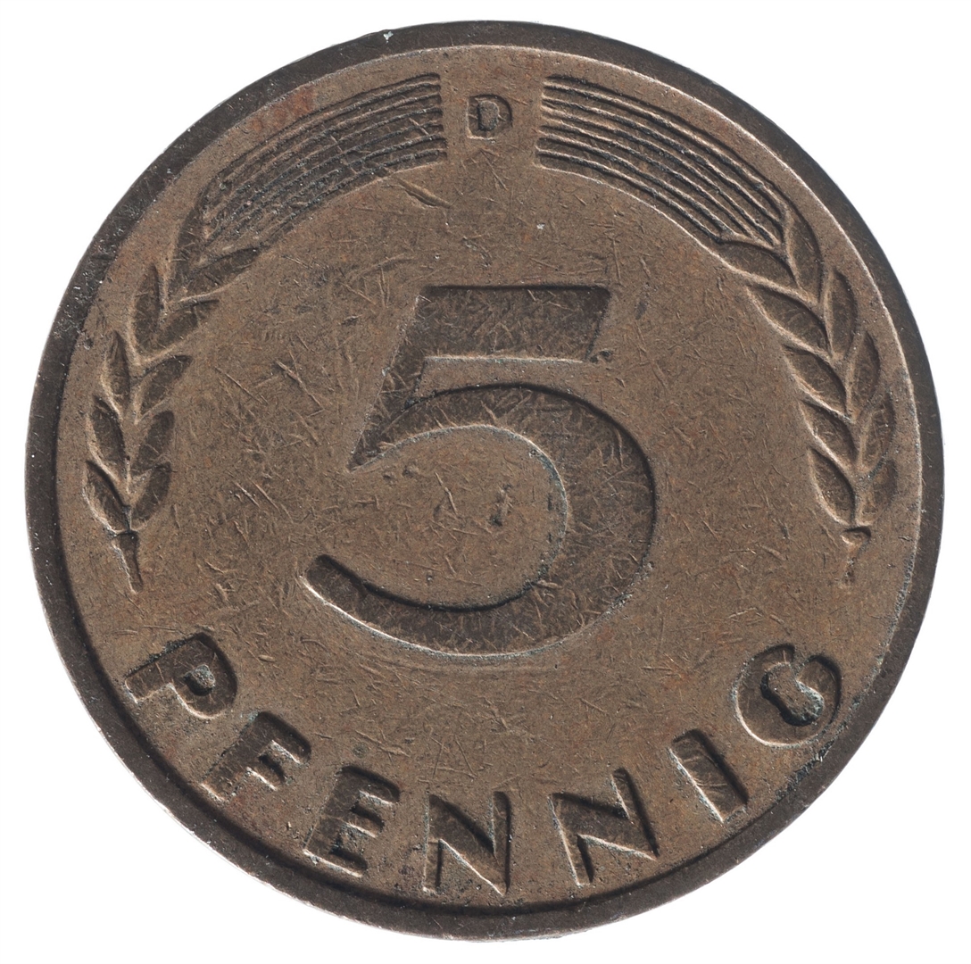 Avers: U sredini mladica hrasta s pet listova u vodoravnoj liniji. Uz rub ispisan tekst BUNDESREPUBLIK DEUTSCHLAND i godina 1950. Revers: U sredini broj 5. Na vrhu slovo D (oznaka kovnice), a uz donji rub riječ PFENNIG.