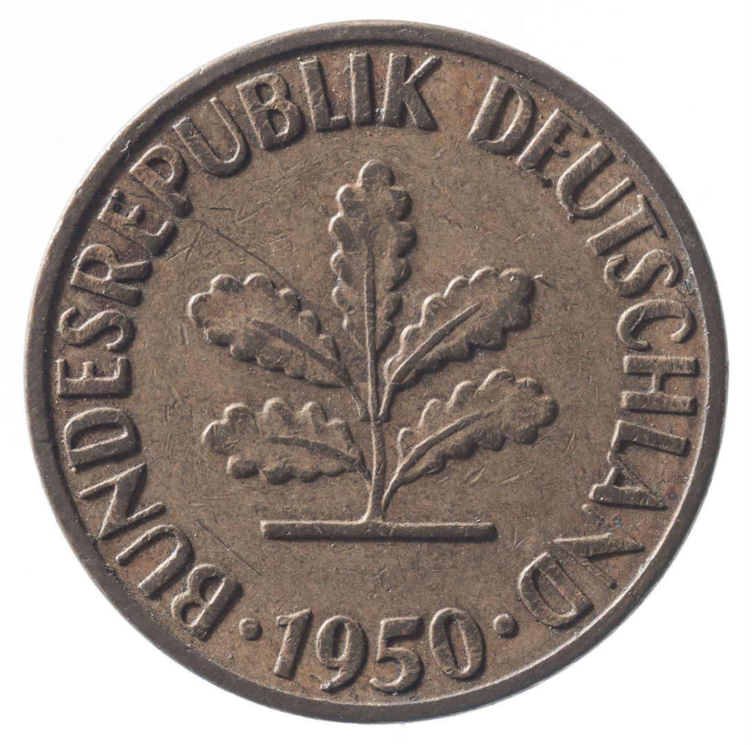 U sredini mladica hrasta s pet listova u vodoravnoj liniji. Uz rub ispisan tekst BUNDESREPUBLIK DEUTSCHLAND i godina 1950.