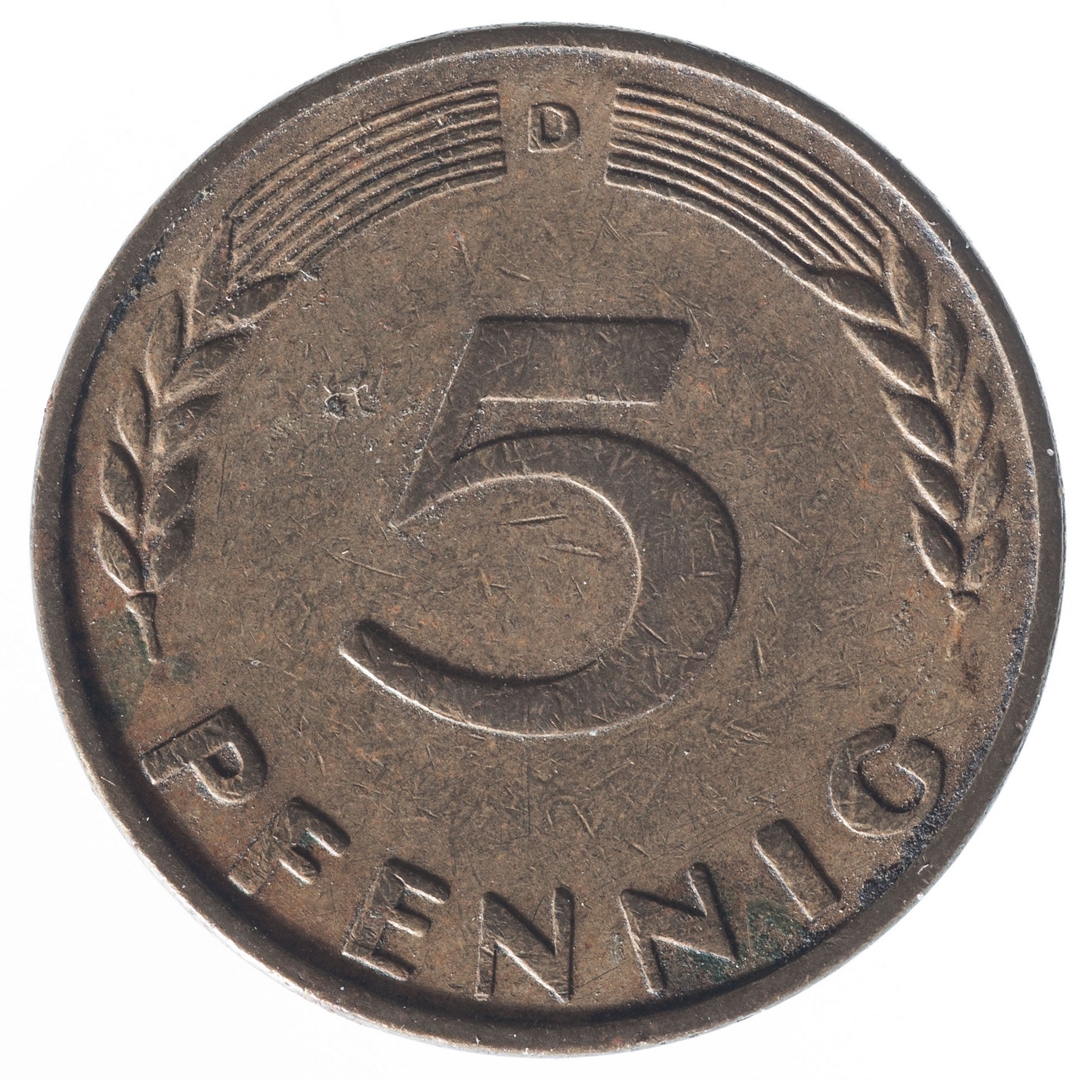 U sredini broj 5. Na vrhu slovo D (oznaka kovnice), a uz donji rub riječ PFENNIG.