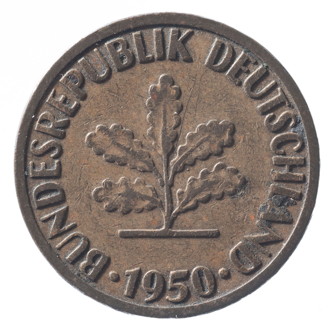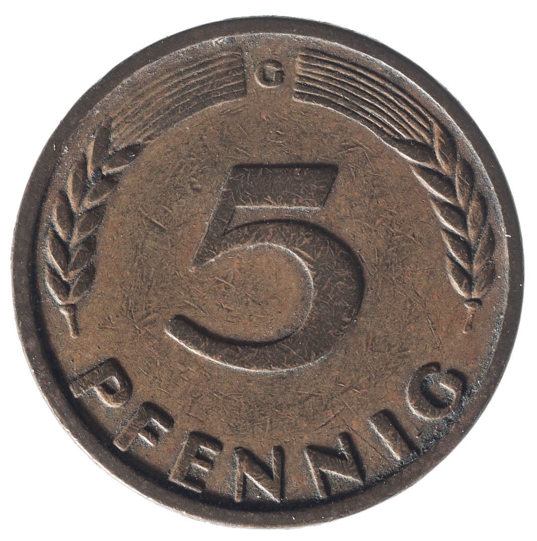Avers: U sredini mladica hrasta s pet listova u vodoravnoj liniji. Uz rub ispisan tekst BUNDESREPUBLIK DEUTSCHLAND i godina 1950. Revers: U sredini broj 5. Na vrhu slovo G (oznaka kovnice), a uz donji rub riječ PFENNIG.