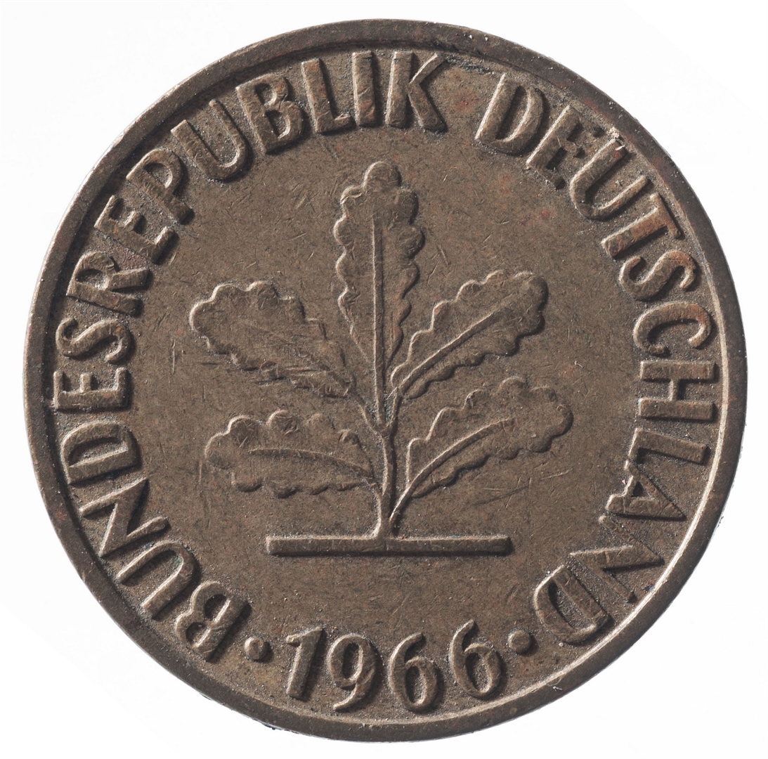 Avers: U sredini mladica hrasta s pet listova u vodoravnoj liniji. Uz rub ispisan tekst BUNDESREPUBLIK DEUTSCHLAND i godina 1966. Revers: U sredini broj 5. Na vrhu slovo F (oznaka kovnice), a uz donji rub riječ PFENNIG.