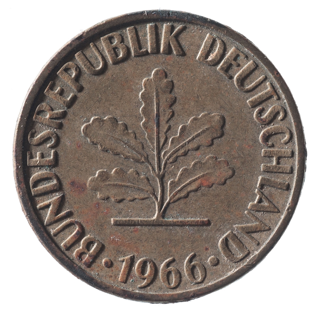 U sredini mladica hrasta s pet listova u vodoravnoj liniji. Uz rub ispisan tekst BUNDESREPUBLIK DEUTSCHLAND i godina 1966.