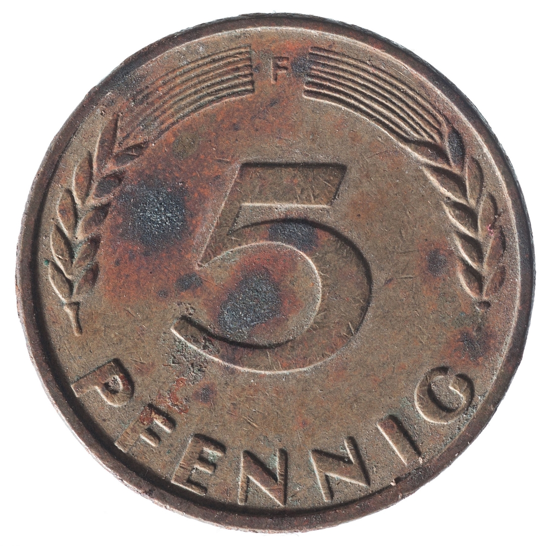 U sredini broj 5. Na vrhu slovo F (oznaka kovnice), a uz donji rub riječ PFENNIG.