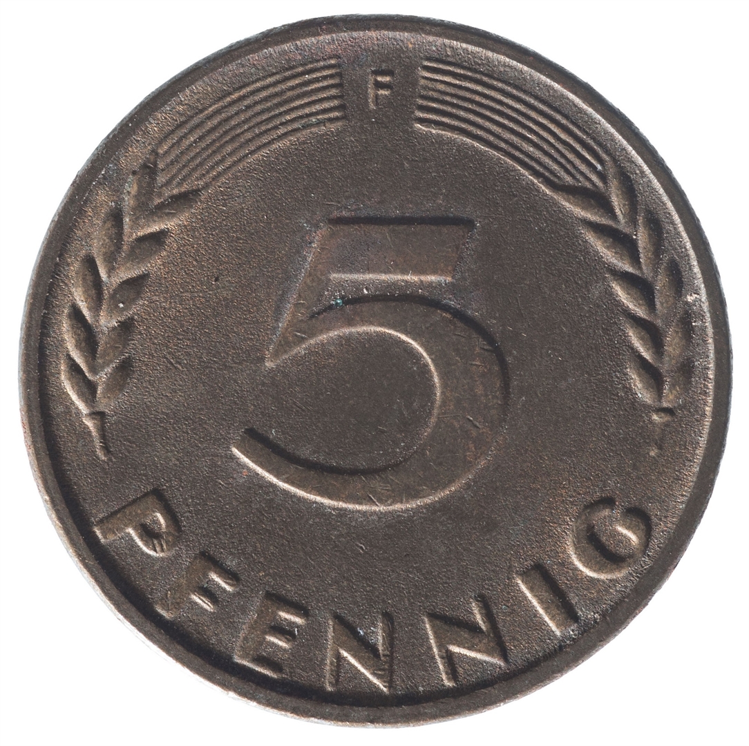 Avers: U sredini mladica hrasta s pet listova u vodoravnoj liniji. Uz rub ispisan tekst BUNDESREPUBLIK DEUTSCHLAND i godina 1967. Revers: U sredini broj 5. Na vrhu slovo F (oznaka kovnice), a uz donji rub riječ PFENNIG.