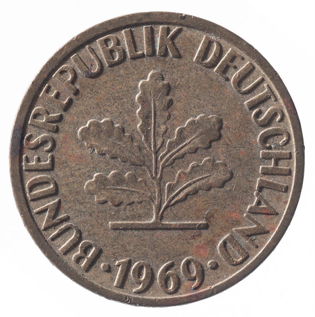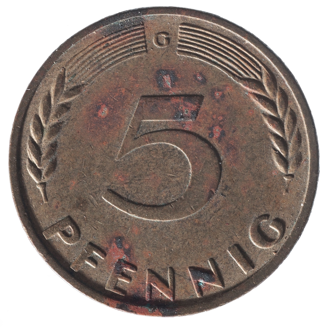 Avers: U sredini mladica hrasta s pet listova u vodoravnoj liniji. Uz rub ispisan tekst BUNDESREPUBLIK DEUTSCHLAND i godina 1969. Revers: U sredini broj 5. Na vrhu slovo G (oznaka kovnice), a uz donji rub riječ PFENNIG.