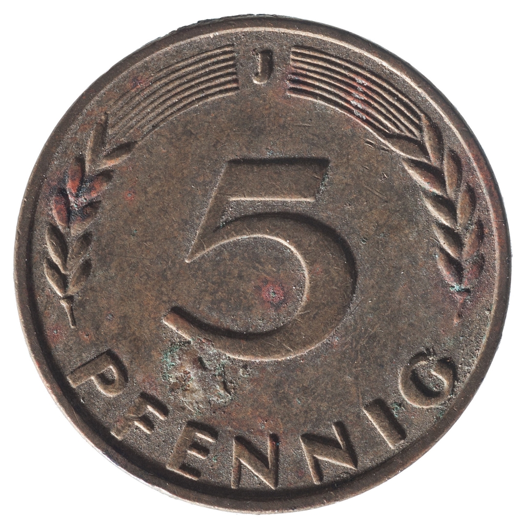 U sredini broj 5. Na vrhu slovo J (oznaka kovnice), a uz donji rub riječ PFENNIG.