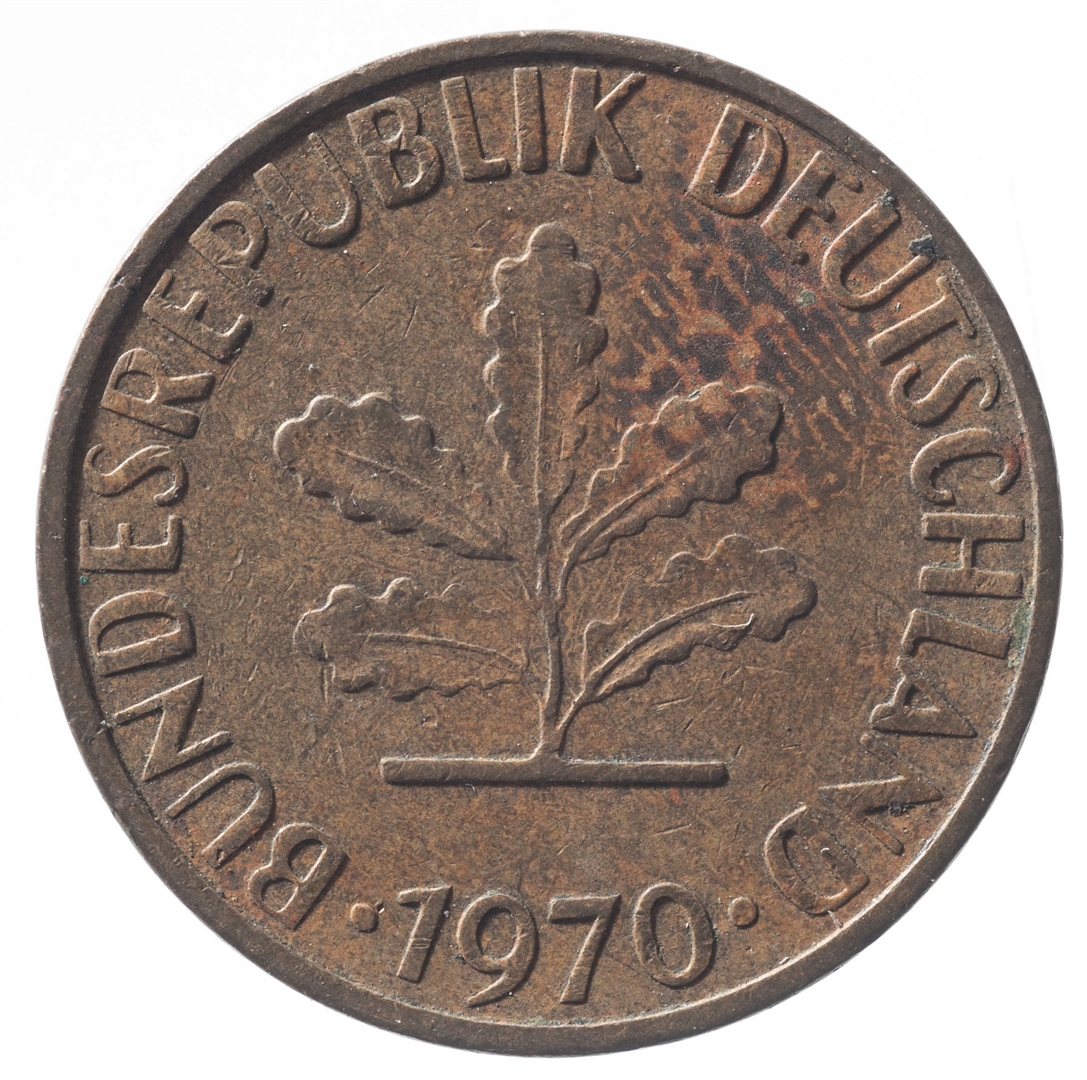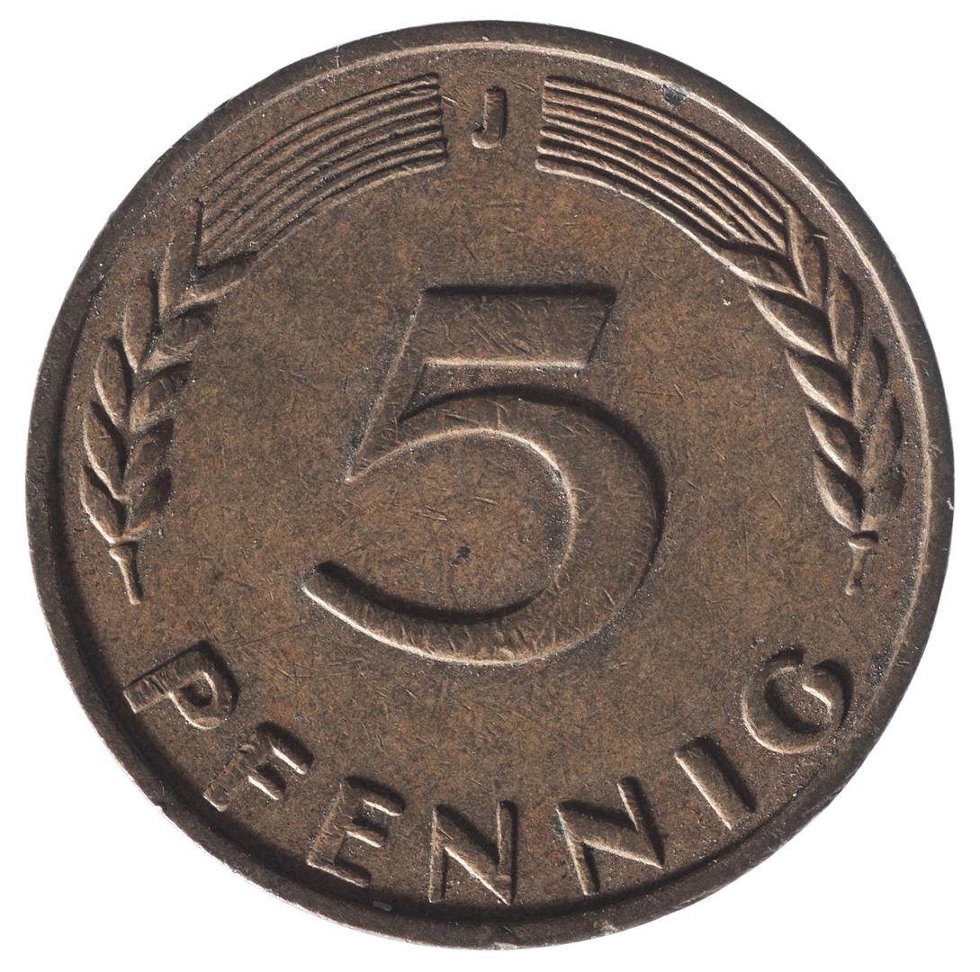 Avers: U sredini mladica hrasta s pet listova u vodoravnoj liniji. Uz rub ispisan tekst BUNDESREPUBLIK DEUTSCHLAND i godina 1970. Revers: U sredini broj 5. Na vrhu slovo J (oznaka kovnice), a uz donji rub riječ PFENNIG.