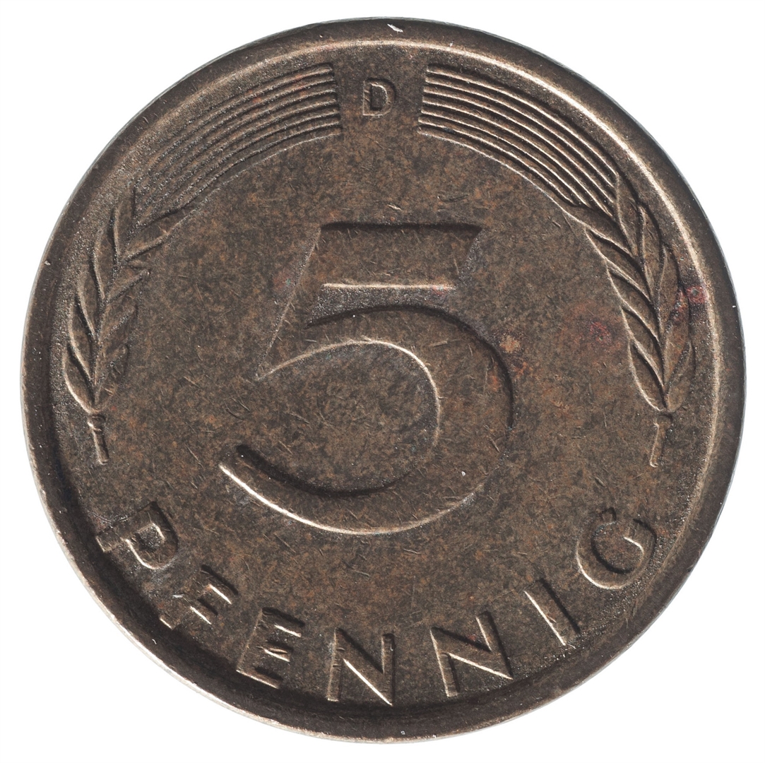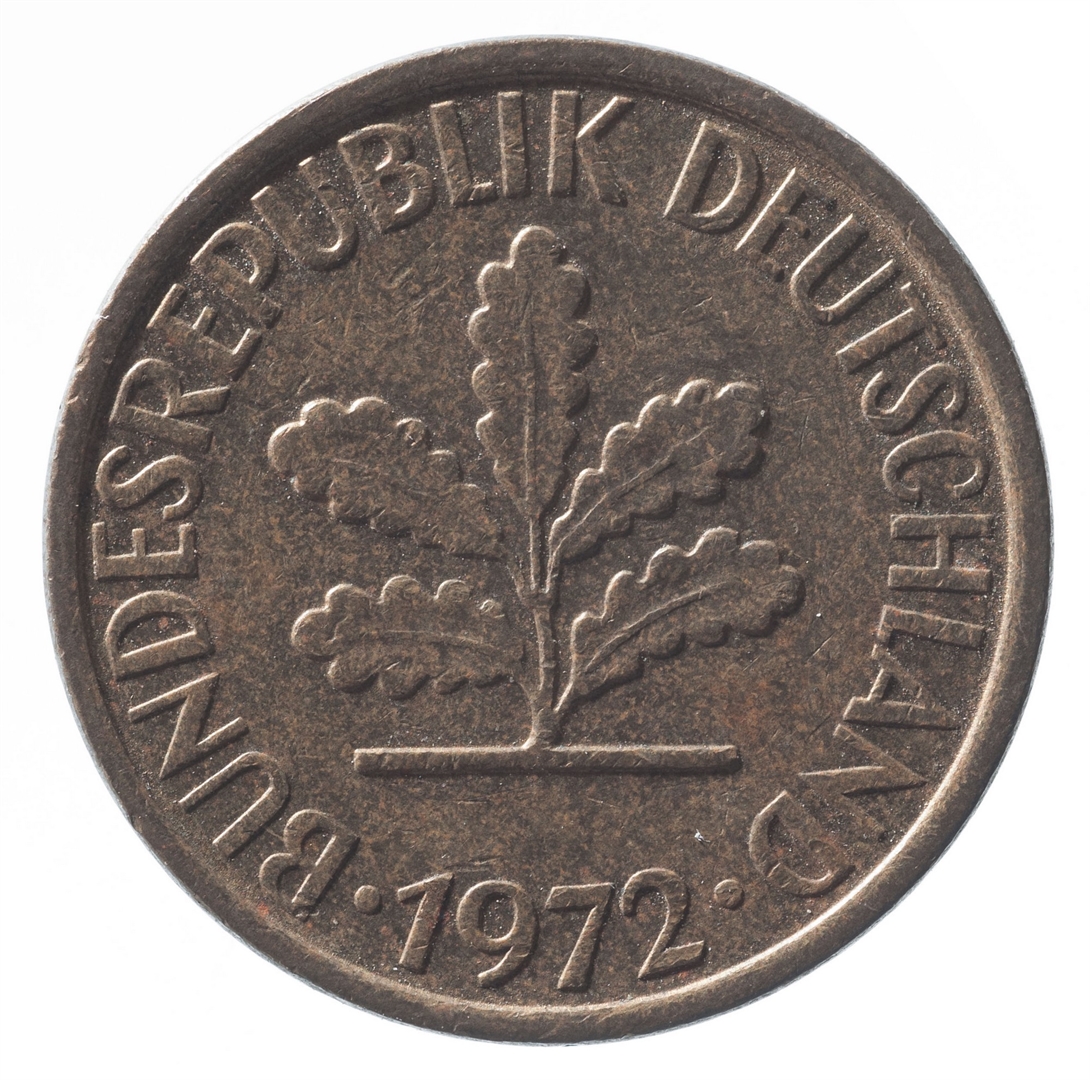 Avers: U sredini mladica hrasta s pet listova u vodoravnoj liniji. Uz rub ispisan tekst BUNDESREPUBLIK DEUTSCHLAND i godina 1972. Revers: U sredini broj 5. Na vrhu slovo D (oznaka kovnice), a uz donji rub riječ PFENNIG.
